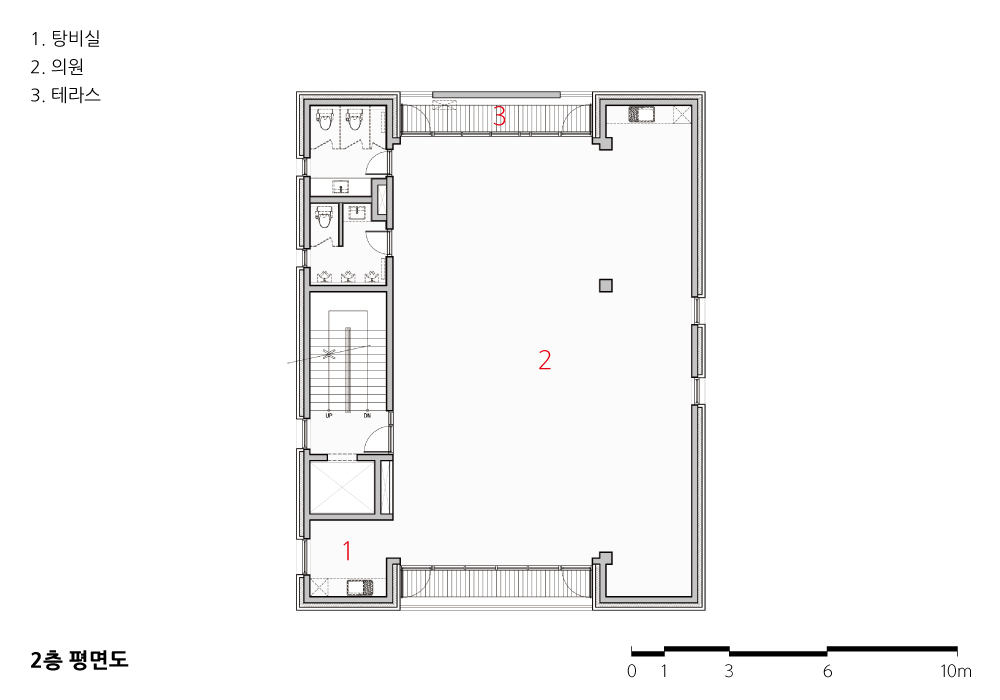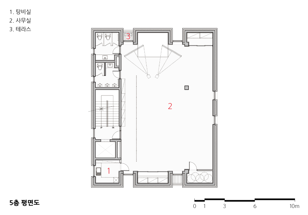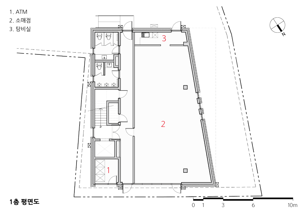 용문역 상업지구 내 위치한 ‘ㄱ’자 형태의 대지. 건축주는 대지 내 공지를 통해 이루어지고 있던 뒤쪽의 상가 및 주택의 통행을 유지하고 지역 주민과의 상생을 고려한 디자인을 요구했다. 무엇보다 도로에 접한 부분은 좁고 안쪽에 넓은 공간이 존재하는 대지 형태로 인해 건물의 접근성과 인지성을 위해 도로에 가깝게 배치를 할지, 건물의 사용성을 고려하여 후면에 배치할지에 대한 논의가 오갔던 상황.