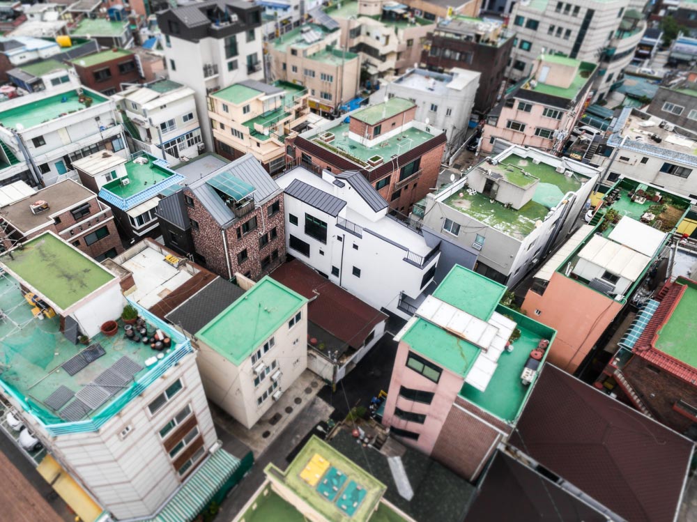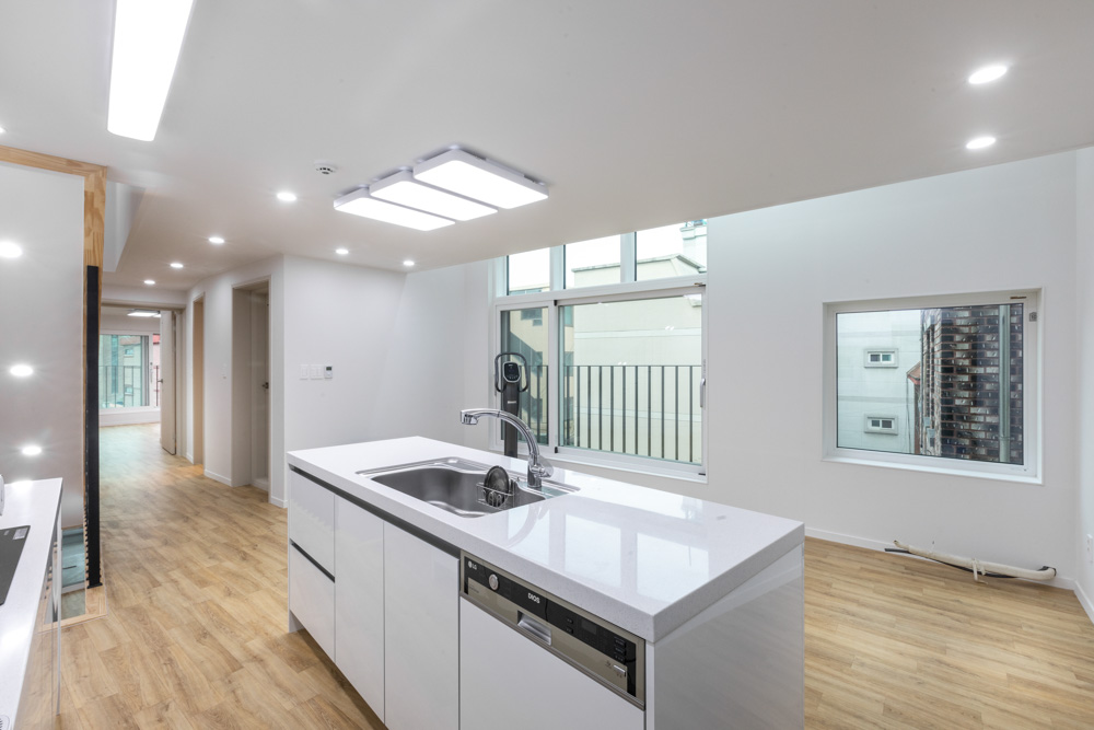 주위 건물들에 둘러싸여 취약한 채광은 낮은 건물들이 있는 진입로 쪽 서측과 남측으로 거실 및 안방의 주 생활공간을 두어 보완하였다.