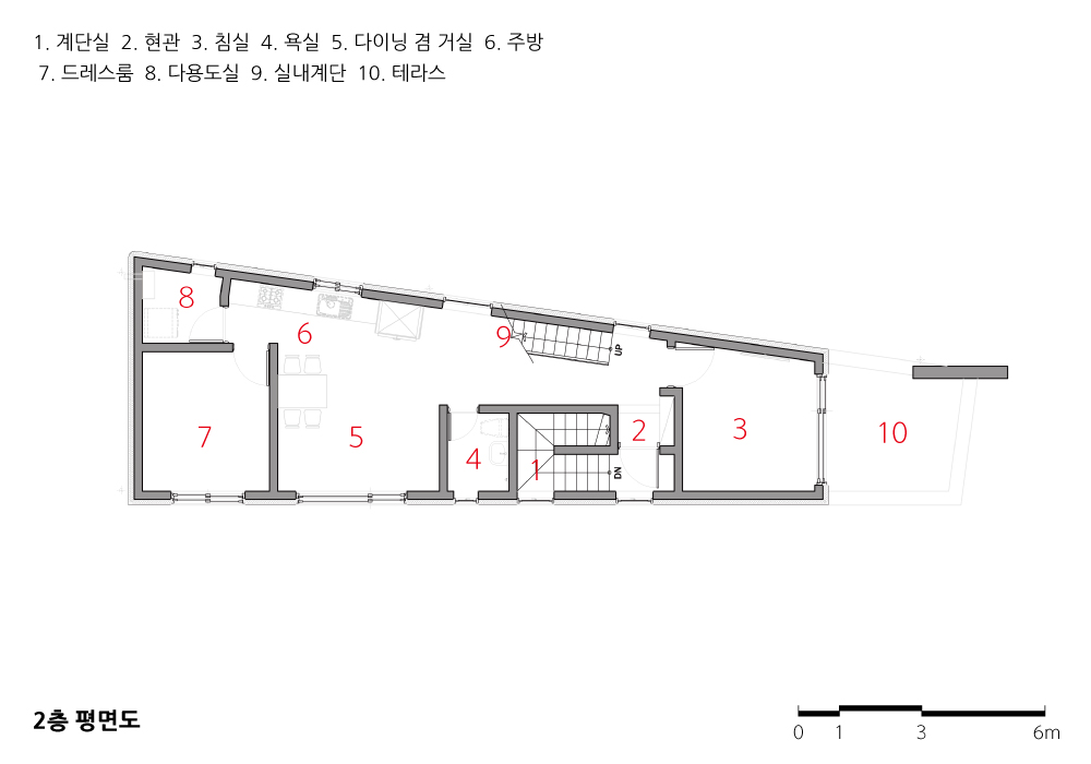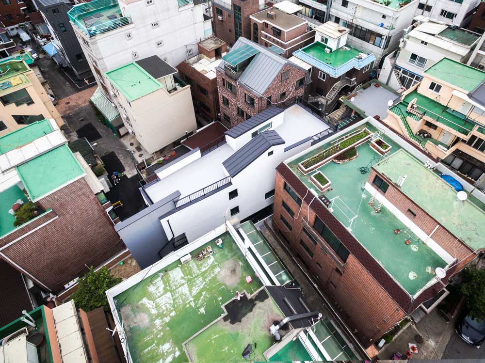 옥상공간은 내부계단과 통해 있고 탁 트인 전망을 제공한다. 대지의 형태처럼 중간을 가로지르는 긴 벽은 1층부터 옥상까지 올라와 너무 인접해있는 건물과의 가림막 역할도 해주면서 외관상의 포인트를 주기도 한다.