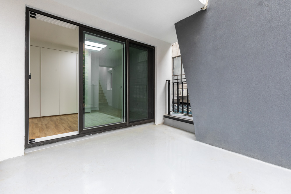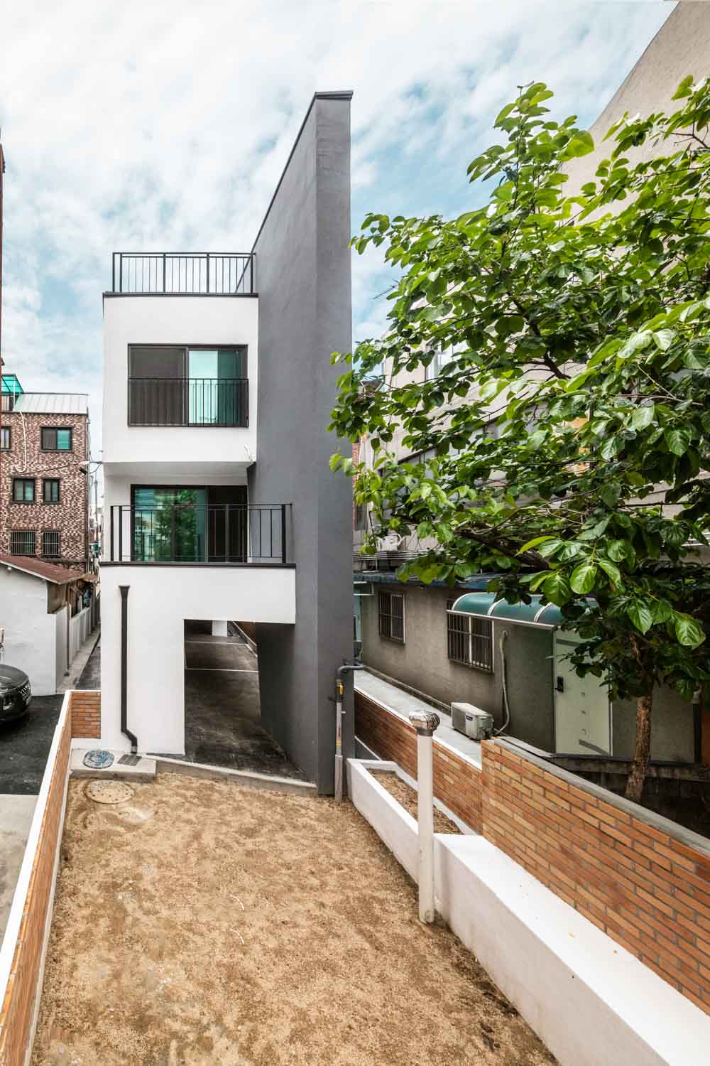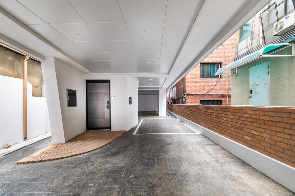 Plan for parking area was using radius of gyration of the vehicle, and the rest of the plan was carried out in consultation with the city. The access at entrance was planned within the turning radius section while vacating the vehicle’s driveway. The building was located on the wider site in the north direction, a piloti was formed, as securing a parking radius, and a wall was made avoiding the vehicle access road. This unique shaped wall serves structural functions and can be a screen for privacy at the same time. Plus, the residents can enjoy the clear scenery from the upstairs terrace in south. The houses facing the east direction are covered for privacy.