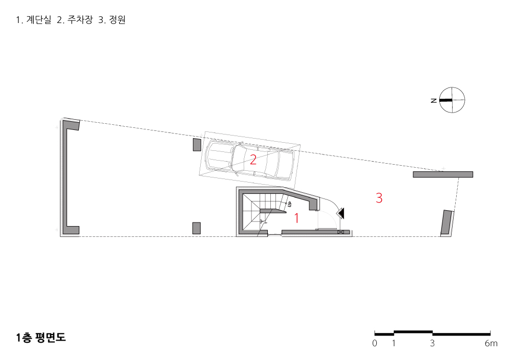 차량이 들어오는 곳을 비우면서 회전반경 구간에 건물 진입로를 계획하였다. 북쪽 방향의 폭이 넓은 대지 쪽으로 건물을 배치하고, 주차 반경을 확보하여 필로티로 세웠으며 차량진출입로를 피해 벽체를 세웠다. 이 벽체는 구조적인 기능을 충족시키면서 차폐의 성격을 가지는 독특한 모양의 벽체다. 2층 테라스 남쪽의 확 트인 뷰를 확보하면서, 동쪽의 집들을 가려 사생활 보호가 된다.