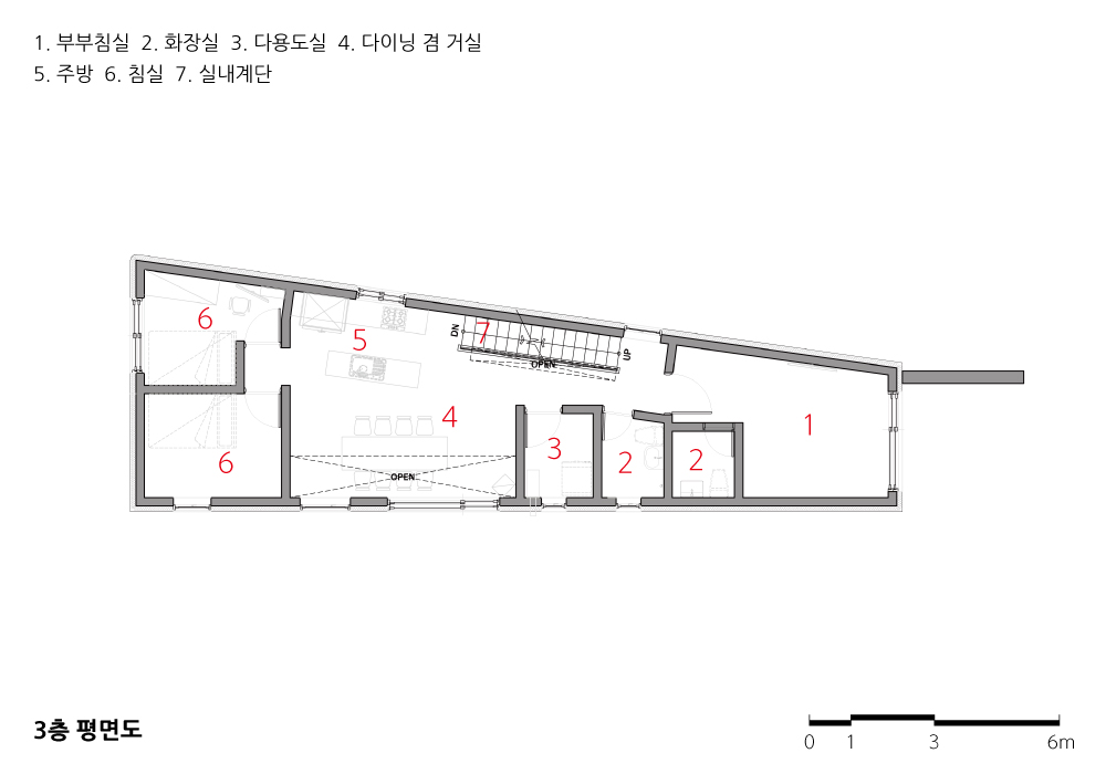 두 가구의 계획 대신 내부 계단을 이용하여 부모님 세대를 층으로 구분하고, 좁은 면적을 보완할 개방감을 찾고자 진입로 필로티 상부 2층에는 테라스를 계획하고 3층의 거실 한쪽 면에 오픈형 천장과 창호를 배치하였다.