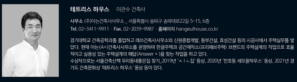 | 테트리스 하우스 설계자 | 이관수 _ (주)아는건축사사무소 건축주 | 문인숙 감리자 | 이관수 _ (주)아는건축사사무소 시공사 | (주)한글공간 대지위치 | 경기도 안양시 동안구 인덕원로12번길 29-3 주요용도 | 단독주택 대지면적 | 170.60㎡ 건축면적 | 85.66㎡ 연면적 | 176.79㎡ 건폐율 | 50.211% 용적률 | 103.62% 규모 | 3층 구조 | 철근콘크리트구조 외부마감재 | 스타코플렉스, 징크 내부마감재 | 석고보드 위 실크벽지 설계기간 | 2018. 12 - 2019. 05 공사기간 | 2019. 07 - 2020. 06 사진 | 김동진 전문기술협력 - 구조분야 : 에스디구조엔지니어링 - 기계설비분야 : 이룸이앤씨 - 전기분야 : 이룸이앤씨 - 소방분야 : 이룸이앤씨 |