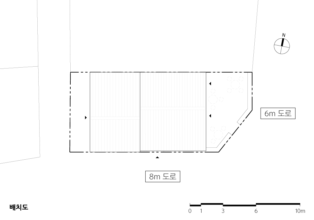 대지 경계와 외부공간 사이에는 낮은 담을 만들었으며, 지나가던 사람들도 앉아서 쉴 수 있는 열린 공간으로 조성했다. 또한 카페 자투리 공간을 외부 테라스로 계획하여, 외부의 자연과 건물 사이에 연계 공간으로 사용할 수 있도록 하였다.