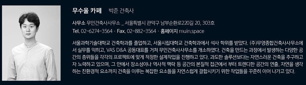 무수울 카페는 커피와 간단한 브런치를 즐길 수 있는 도심 속 작은 카페로 기존의 목조주택의 틀에 실내 벽체를 모두 철거한 오픈된 내부공간을 가지고 있다. 또한 프레임 없는 창을 이용해서 외부의 자연풍경을 바라볼 수 있도록 계획하였고, 작은 공간을 최대한 넓게 사용하고자 했다.