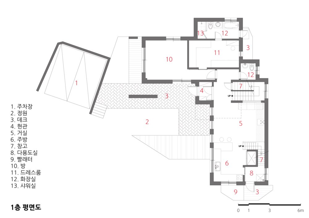The 'ㄱ' shaped mass utilizing the unique form of the site and the garden embraced in the mass were laid out to secure a view from the living room and the main room. On the west side, there are static spaces such as a master bedroom, a room, a dress room and a bathroom, and on the east side, dynamic spaces such as a living room and a kitchen, while separating areas through the entrance and a staircase to secure each room’s privacy and enable the living room and the kitchen to see the garden as much as possible.
