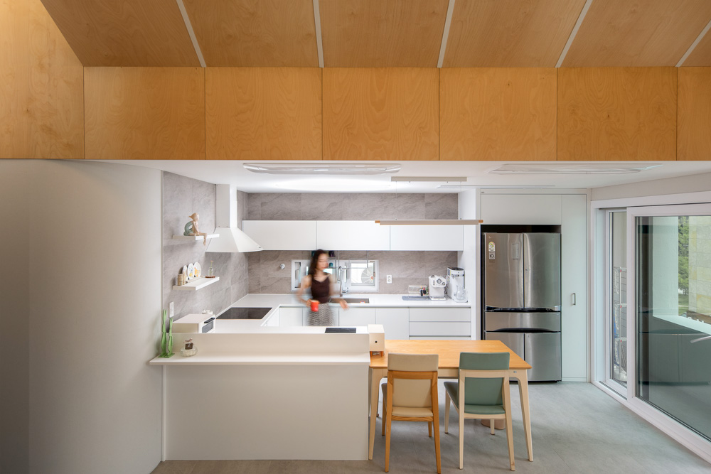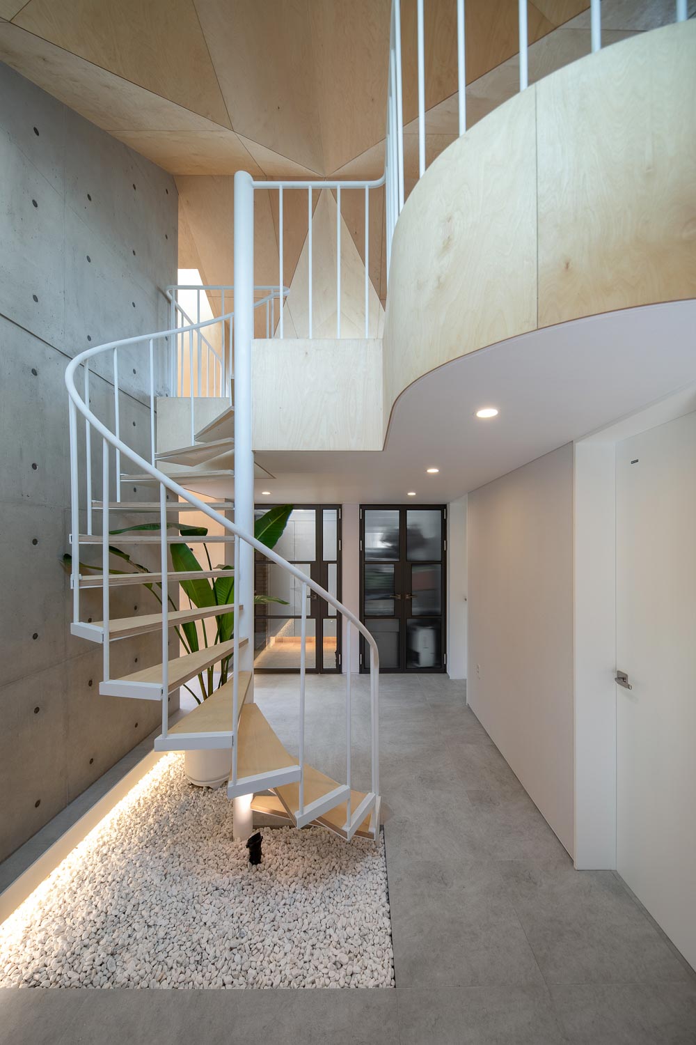 In addition, plant boxes are from the exterior wall protrusion (excluded from the building area) that are normally used for an air-conditioner unit to make the green view from the window and create the unique elevation of the building, giving its identity. The rooftop landscape was designed to make the rooftop have a sense of space like a yard, not just a simple roof, and to create a green landscape seen from the hall and the attic on the 3rd floor. The attic allows communication with the living room on the 3rd floor. The 3rd-floor living room is a warm, stable space as a house while giving a different sense of space with a high ceiling, a pitched roof finished with birch, and the sunshine through the skylight.
