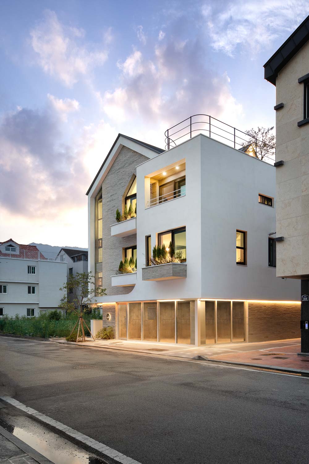 The planned site is in the housing site development district in Mulgeum, Yangsan. As mentioned above, district-unit planning guidelines affect the form and space of architecture. Under this circumstance, we thought: about how to enrich the client's life living in the requested building, how to create a pleasant living environment while satisfying the client's request as much as possible, and how to give this building its own identity with a limited budget unlike the uniform buildings around it.