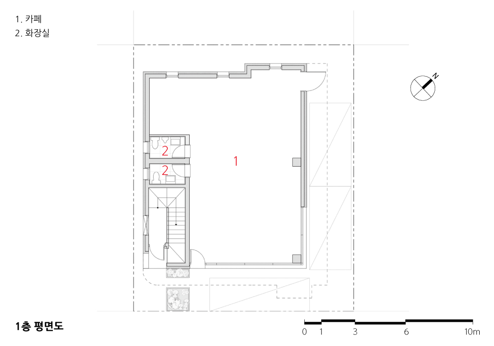 계획부지는 양산의 물금에 있는 택지개발지구에 위치해 있고, 앞서 언급한 바와 같이 건축의 형태와 공간에 영향을 미치고 있는 지구단위계획지침이 수립되어 있다. 그러한 상황 속에서 의뢰받은 건물에 사는 건축주의 생활을 어떻게 하면 조금 더 풍요롭게 할 수 있을지, 어떻게 하면 건축주의 요구사항을 최대한 수용하면서 쾌적한 거주환경이 될 수 있을지, 어떻게 하면 주변의 획일화된 건물들 사이에서 한정된 예산으로 이 건물만의 아이덴티티를 부여할 수 있을지가 설계의 목표였다. 거주공간은 내·외부공간이 유기적인 관계를 이룰 때 사람의 삶을 더 풍요롭게 만들어주지만, 한정된 면적에 건축주의 방의 개수에 대한 요구사항을 수용하다 보니, 내·외부공간의 관계를 유기적으로 맺게 하기란 불가능에 가까웠다. 결국 대안으로 법적 조경과 창문 하부의 플랜트박스와 옥상조경을 최대한 활용하여 ‘진입과 내부의 녹색 풍경 만들기’를 시도했다. 대부분의 택지개발지구에서 건물의 배면 혹은 남는 공간 어딘가로 밀려나는 조경공간을 건물 전면인 1층 상가 출입구와 주거 출입구 사이에 배치하고, 건물과 어우러지는 하나의 풍경이 될 수 있도록 했으며 진출입 시 조경공간을 지나도록 하였다.