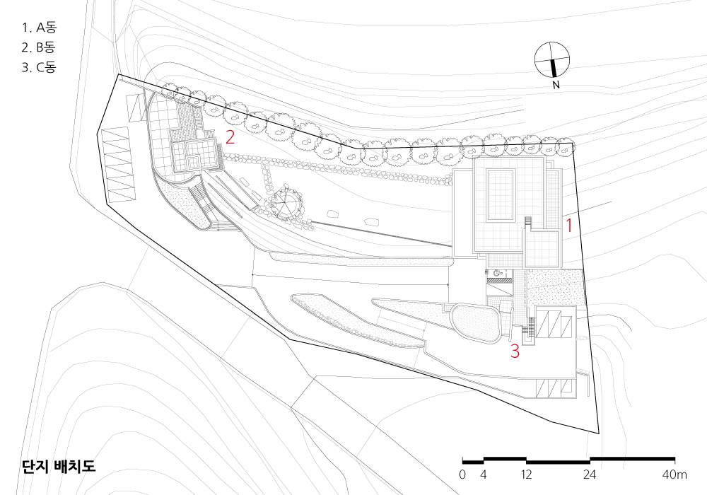 It was proposed as three buildings: the main building, an entrance building, and a parking building of four floors above ground to borrow the surrounding landscape and effectively use the wide flat area on the hill. As a result, it was completed as a complex that captures the natural scenery and provides various spaces, including a central courtyard. The building is divided into the main building(Building A), consisting of a bakery cafe, a restaurant, and a detached house; an entrance building(Building B) that will be used as the main entrance to the coffee shop, and Building A; and a parking building(Building C) that will be used as a parking lot and a gallery. To preserve the trees in the central courtyard as much as possible and overcome the height difference of the site, the proper location and size of each building were reviewed to complete the form, space, and movement flow line so that it could naturally lead to their functional connections.