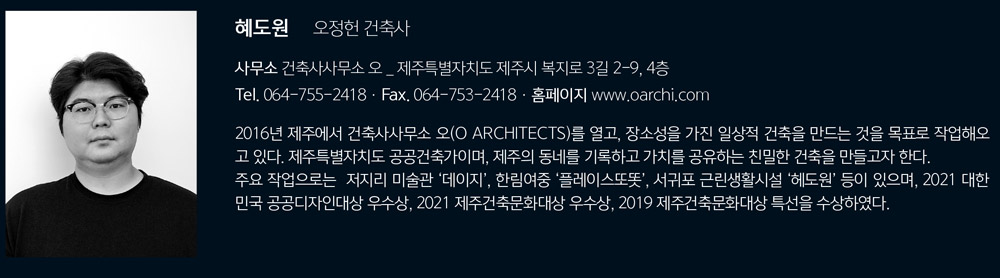 | 혜도원 설계자 | 오정헌 _ 건축사사무소 오 건축주 | 조창우 시공사 | 더프라임건설 대지위치 | 제주특별자치도 서귀포시 남원읍 일주동로 6793 주요용도 | 제1종 근린생활시설 대지면적 | 509㎡ 건축면적 | 131㎡ 연면적 | 196㎡ 건폐율 | 25.6% 용적률 | 38.5% 규모 | 2층 구조 | 경량철골구조 외부마감재 | 갈바늄강판(파형골타입) 내부마감재 | 친환경수성페인트, 셀프레벨링 등 설계기간 | 2019. 04 - 2019. 08 공사기간 | 2020. 09 - 2020. 02 사진 | 최진보 전문기술협력 - 기계설비분야 : 한성이엔지 - 전기분야 : 한성이엔지 |