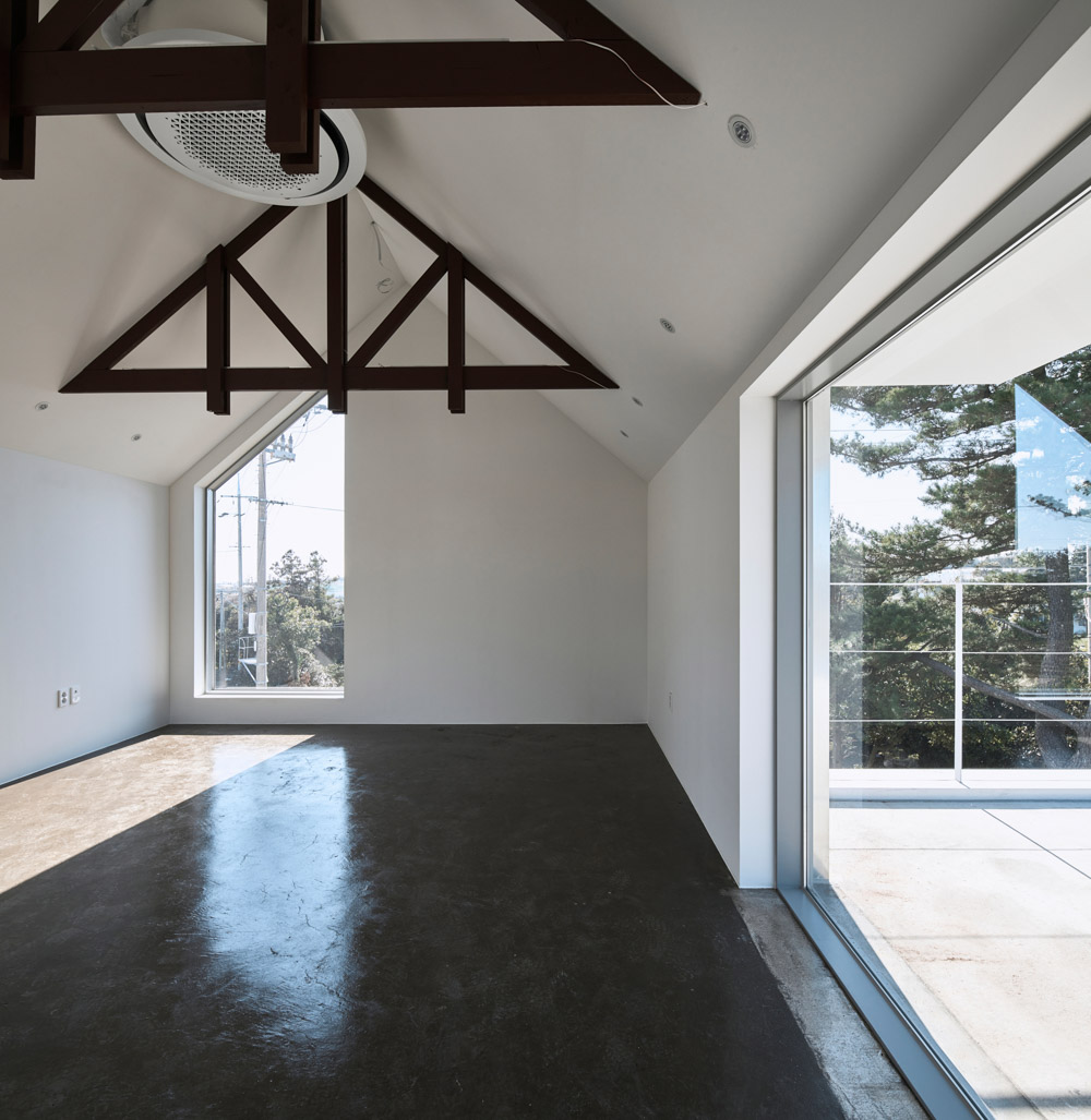 The structure and form of the space are simple, with a pitched roof. The form is completed therein by opening the eyes through a mismatch between the symmetry and the mass with its head facing the sea. The window and the outdoor space are open toward the sea and sky, and the light and scenery from the outside come indoors.