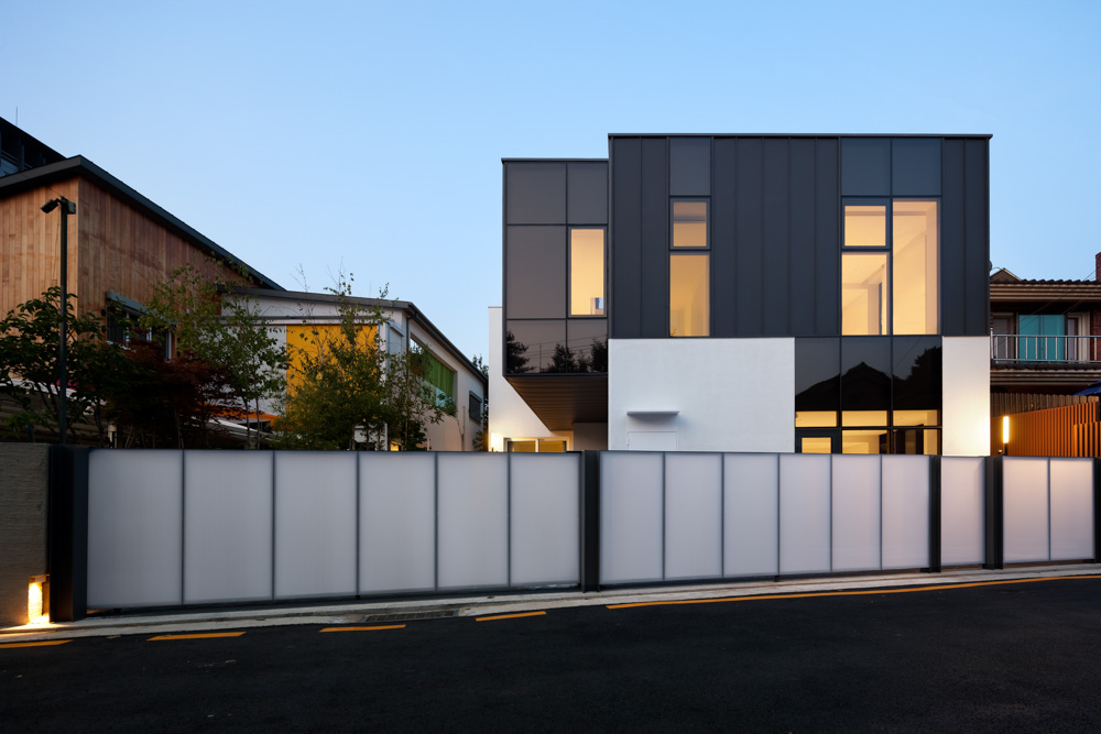 건물 내부공간이 벽과 천장, 벽과 바닥 사이에 형성된 크고 작은 틈에 의해 각 영역의 다양성과 표정이 연출된다면 건물 외부공간은 각 영역을 수직으로 적층시키며 중정 쪽으로 시선을 끌어들이도록 연출되고 있다. 주차영역을 포함한 대지 전체를 푸른빛 타일 바닥과 나무껍질 모양의 벽으로 감싸고 그 위에 300밀리미터 정도를 들어 올려 나무바닥과 나무벽을 얹고, 다시 그 위에 세 켜의 흰색 페인트 마감 매스와 검은색 금속 입방체를 끼워 놓는다. 이러한 과정을 통해 각 주택의 진입과 소통을 이루는 중정 영역으로 공간이 중첩되고 압축되는 느낌을 형성한다.