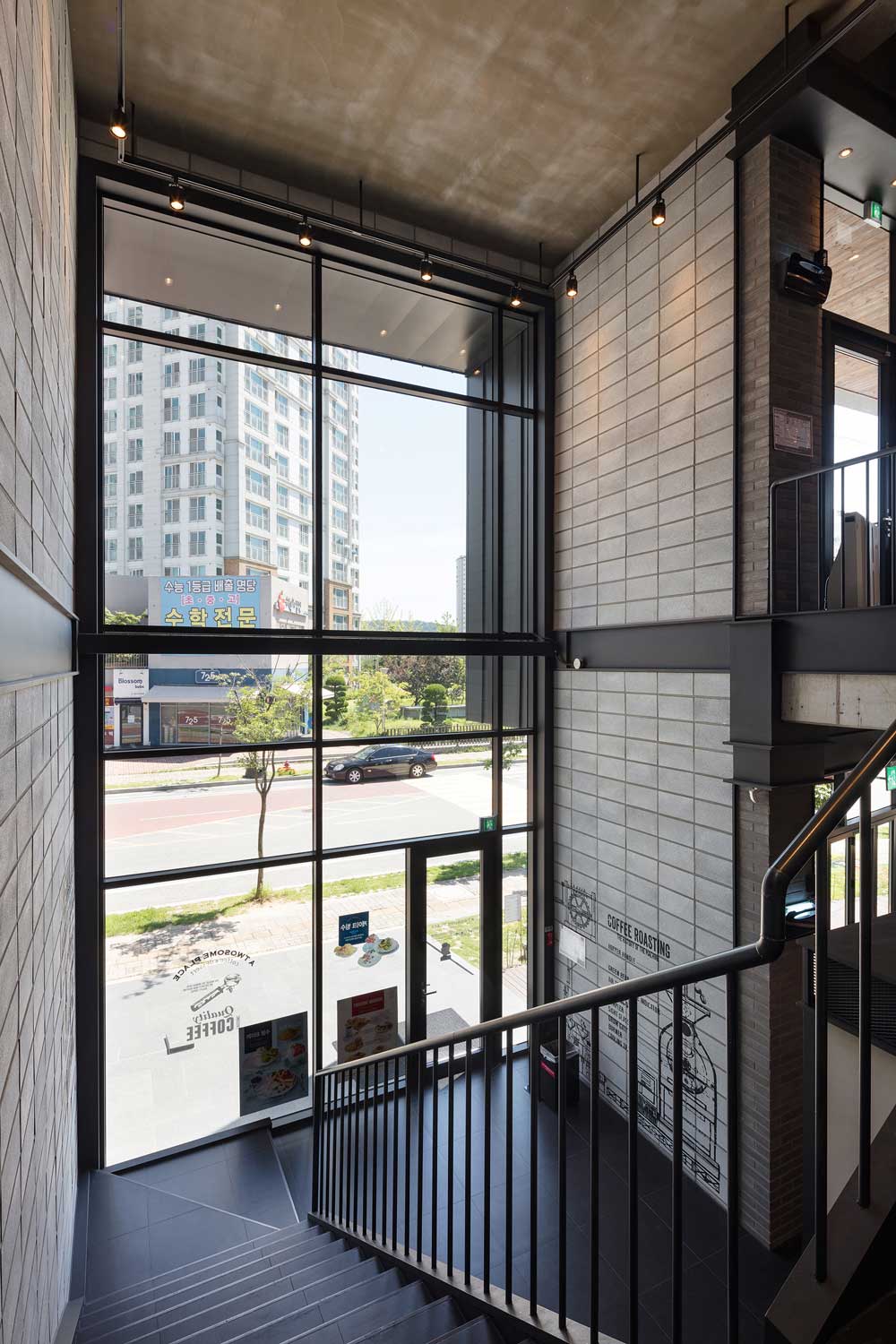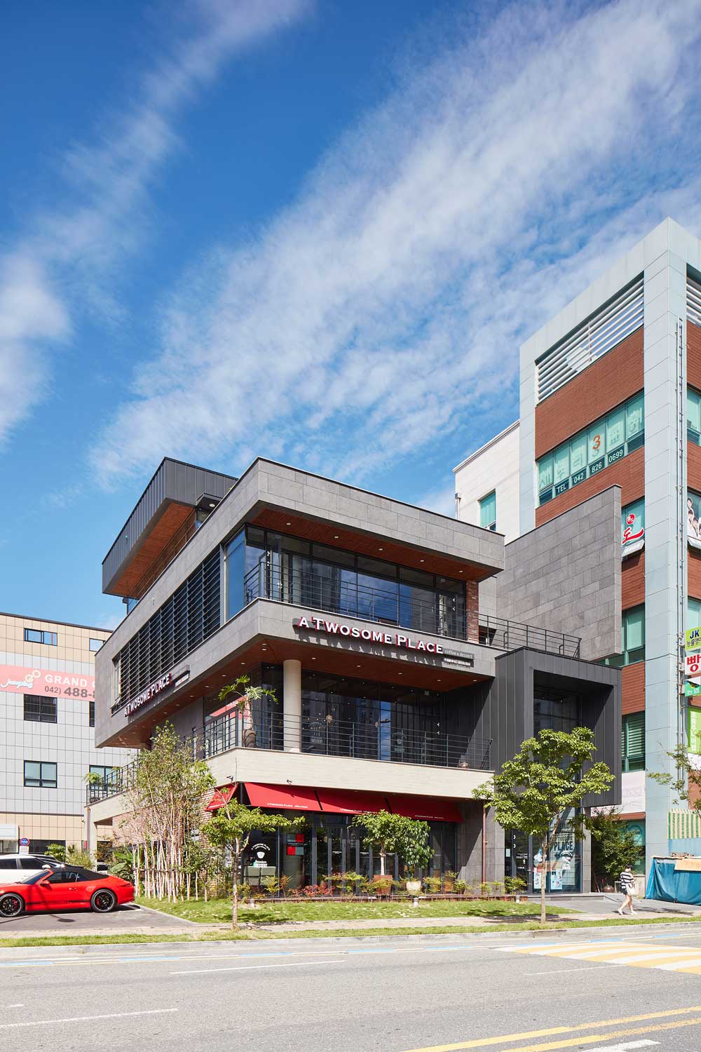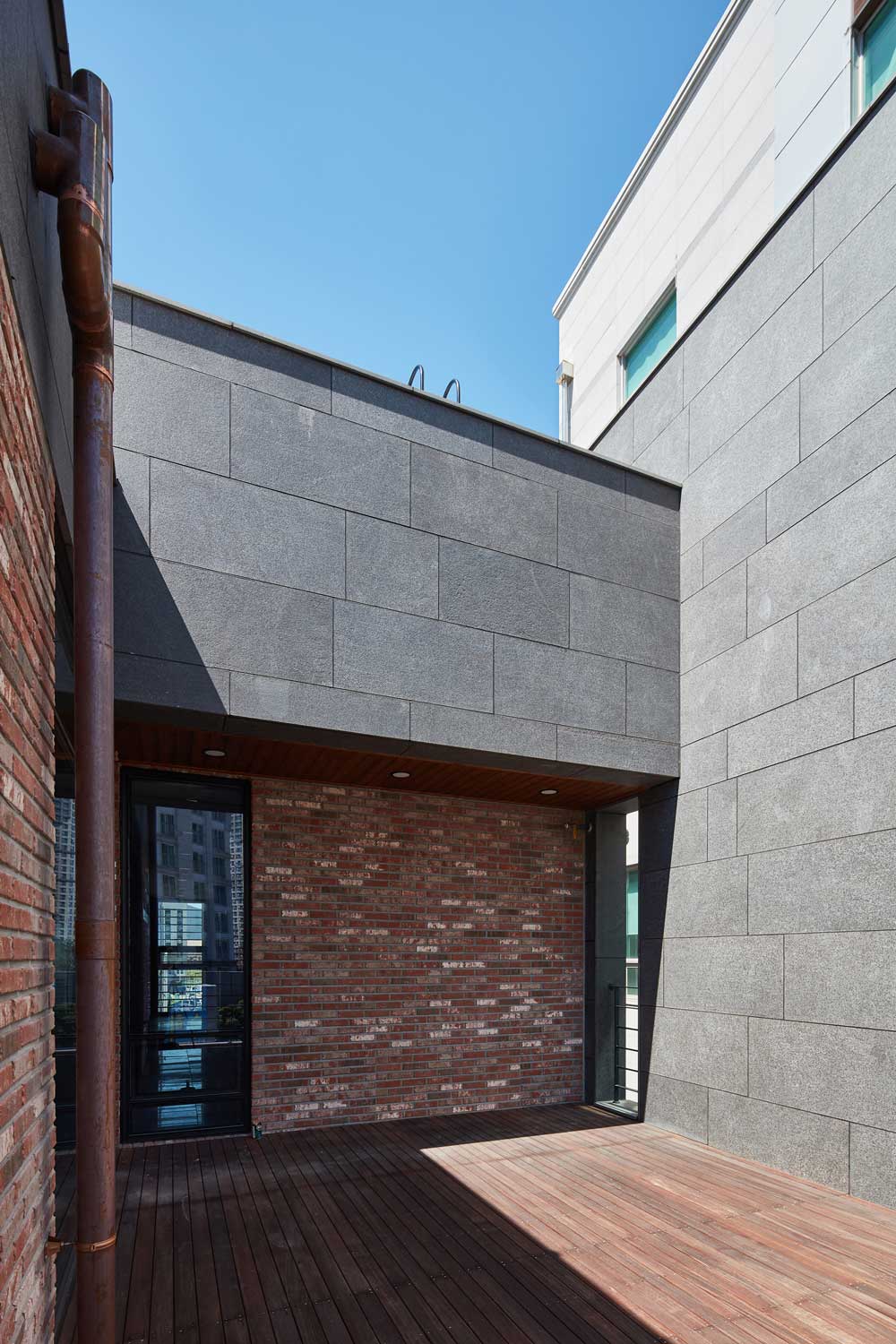 By the vertical zoning plan, first and second floor are for a coffee shop, and the third floor is a leased space and the fourth floor is the owner's office. Horizontally, the core was placed along the north side to block unfavorable external conditions and to secure the south view. The volume that could be monotonous was changed by various types of balconies, and pine trees across the eastern side was set as the main view, and it was opened aggressively. The elevation was materialized by pine board exposed concrete, Macheon Granite burner finish, antique brick and zinc to make it look naturally over time. It is also well suited to the interior image of the tenant retail.