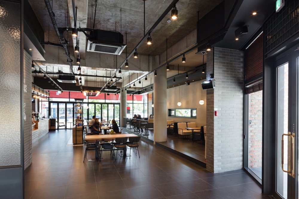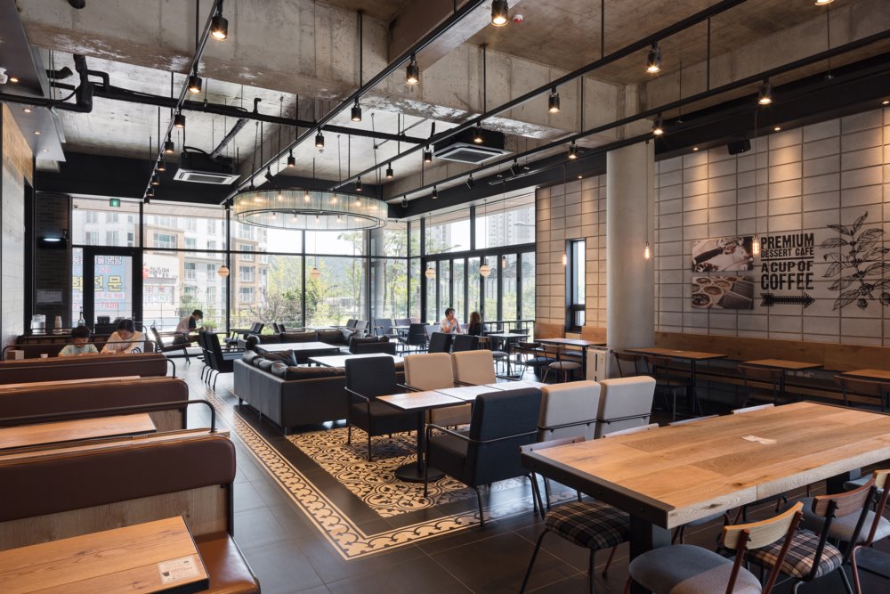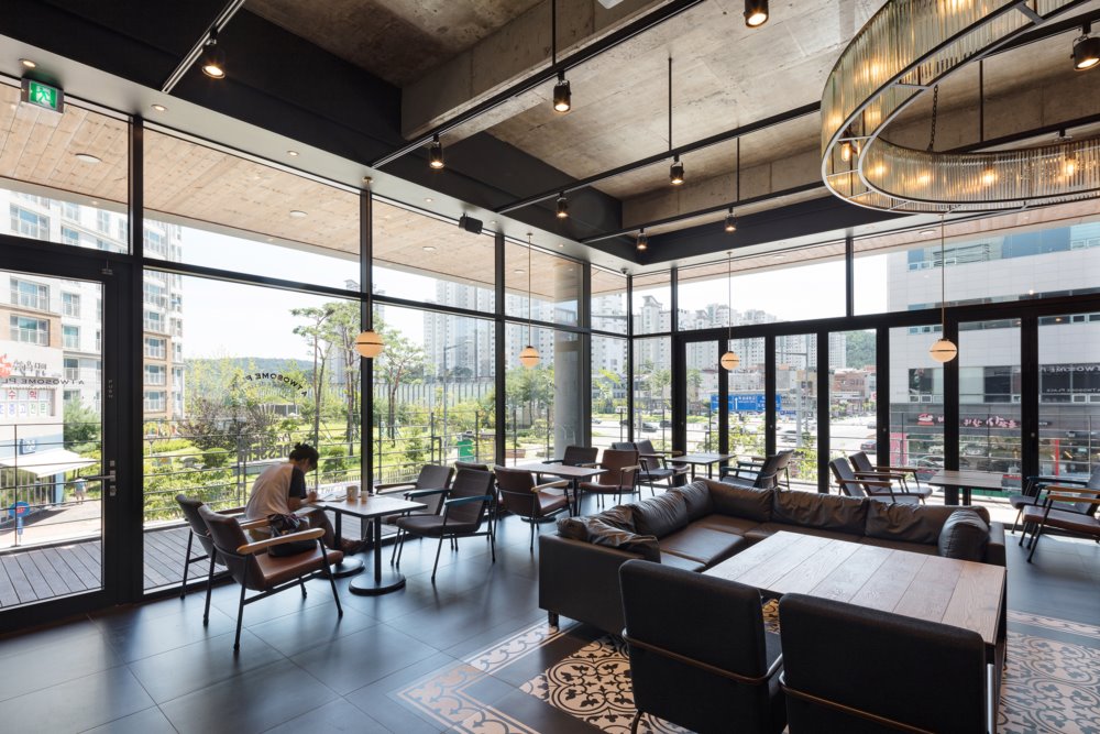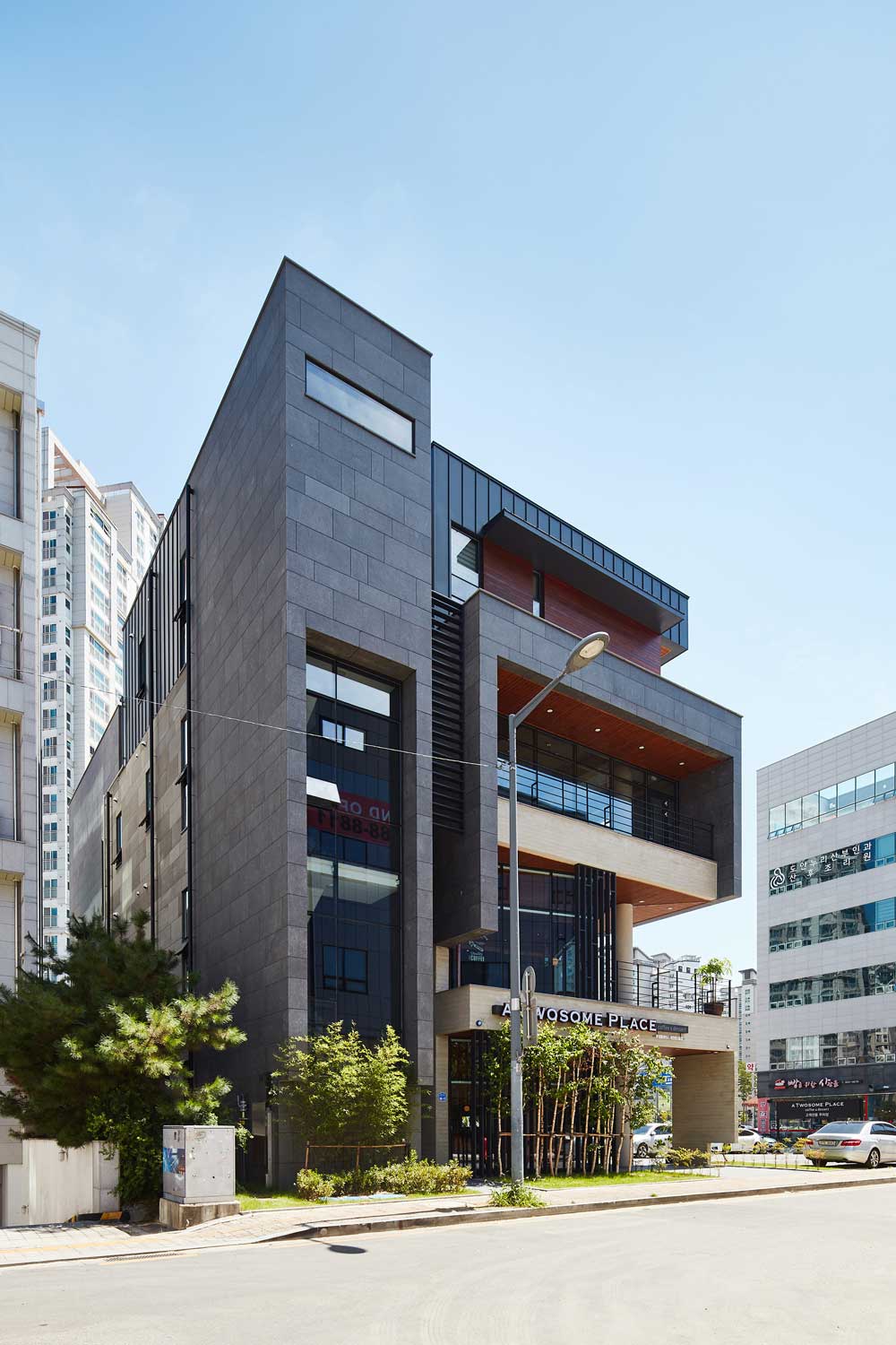 By the vertical zoning plan, first and second floor are for a coffee shop, and the third floor is a leased space and the fourth floor is the owner's office. Horizontally, the core was placed along the north side to block unfavorable external conditions and to secure the south view. The volume that could be monotonous was changed by various types of balconies, and pine trees across the eastern side was set as the main view, and it was opened aggressively. The elevation was materialized by pine board exposed concrete, Macheon Granite burner finish, antique brick and zinc to make it look naturally over time. It is also well suited to the interior image of the tenant retail.