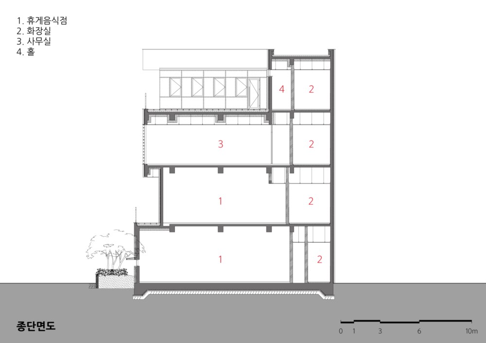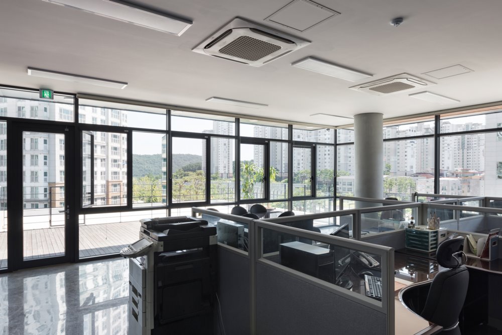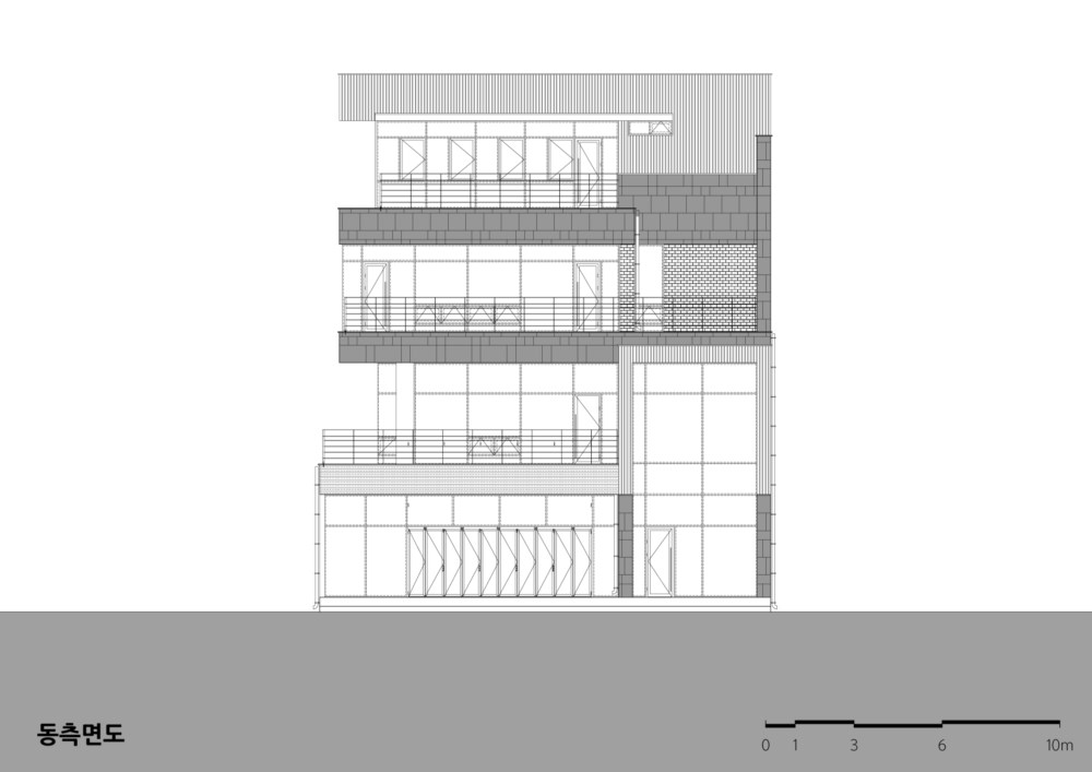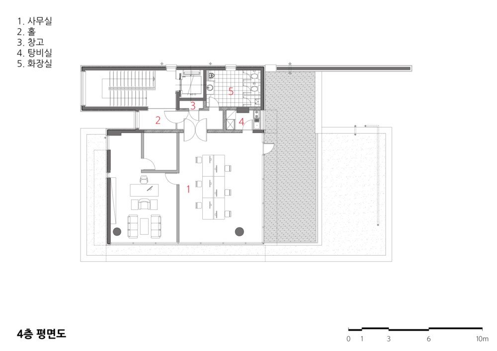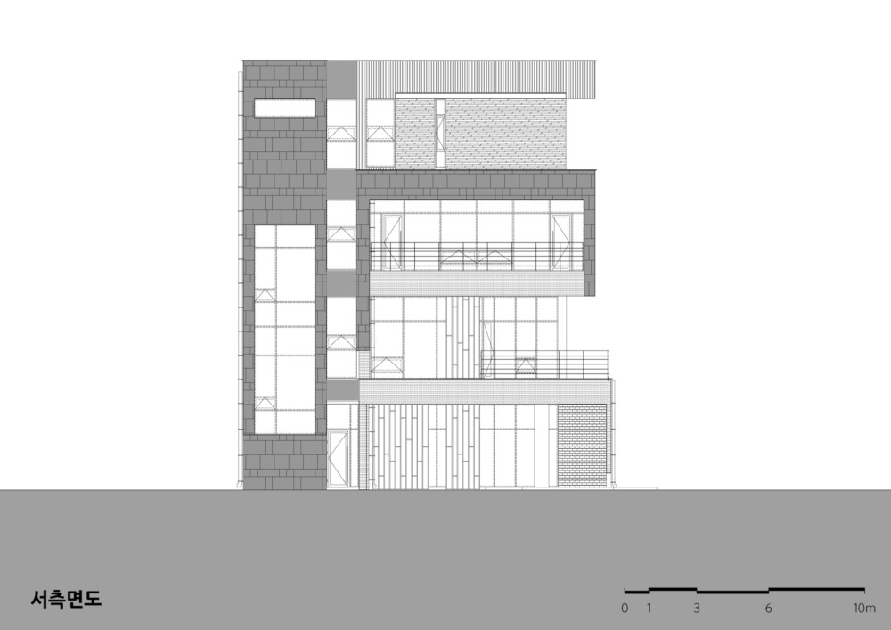 3층은 넓게 한 공간으로 또는 두 개의 공간으로 융통성 있게 임대 놓을 수 있게 하였고, 4층은 사옥으로 필요한 공간만 남기고 외부 데크를 두어 사옥이라는 프로그램의 특성상 발생 할 수 있는 여러 행사를 흡수 할 수 있게 했다. 입면에는 각 측면의 향에 맞는 루버를 설치하여 태양광을 조절했다.