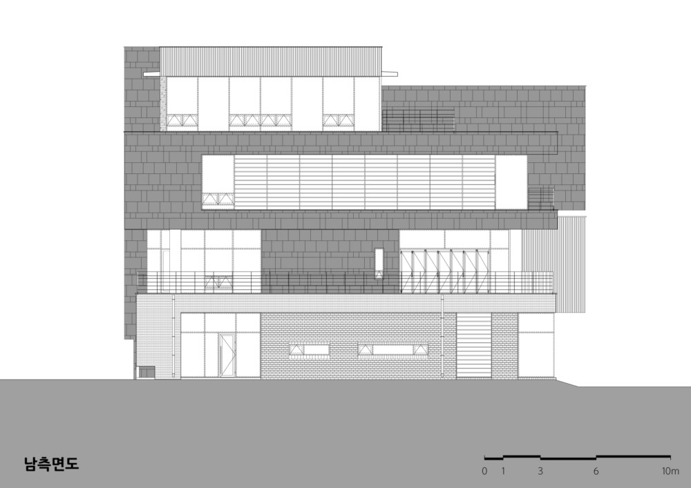 층별 조닝은 1, 2층을 한 공간으로 오픈하여 커피숍으로 쓰게 하였고, 3층은 임대 공간, 4층은 사옥으로 구성했다. 수평적으로는 코어를 북측에 길게 배치하여 불리한 외부조건을 차단하고 남측 전망을 확보했다. 자칫 단조로울 수 있는 볼륨을 여러 형태의 발코니를 두어 변화가 있게 했으며, 동측 길 건너 소나무 조경을 메인 뷰로 정하고 적극 개방시켰다. 입면의 재료는 세월의 때가 자연스럽게 묻을 수 있는 송판노출콘크리트, 마천석 버너구이, 고벽돌, 징크 등을 사용하여 전체적으로 차분하면서 중후한 이미지를 만들고자 했다. 이는 입점 시킨 브랜드의 내부 인테리어 이미지와도 잘 어울린다.