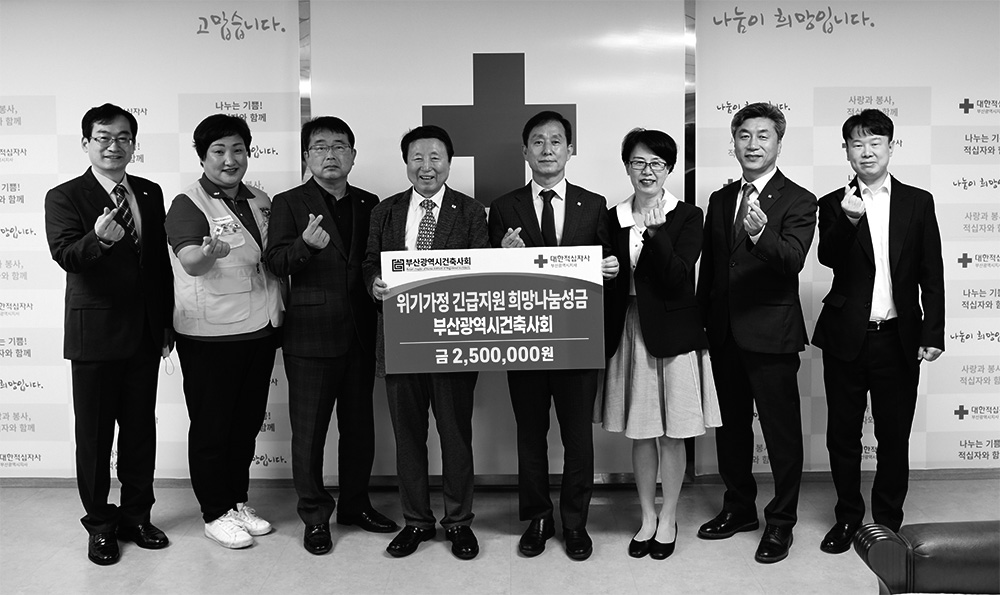 부산광역시건축사회가 5월 24일 대한적십자사 부산지사에 ‘위기가정 긴급지원 희망나눔성금’ 250만 원을 기부했다. 서정의 대한적십자사 부산지사 회장은 “기탁해주신 성금은 건축사 회원들의 소중한 뜻과 함께 잘 전달하겠다”며 감사를 표했다.