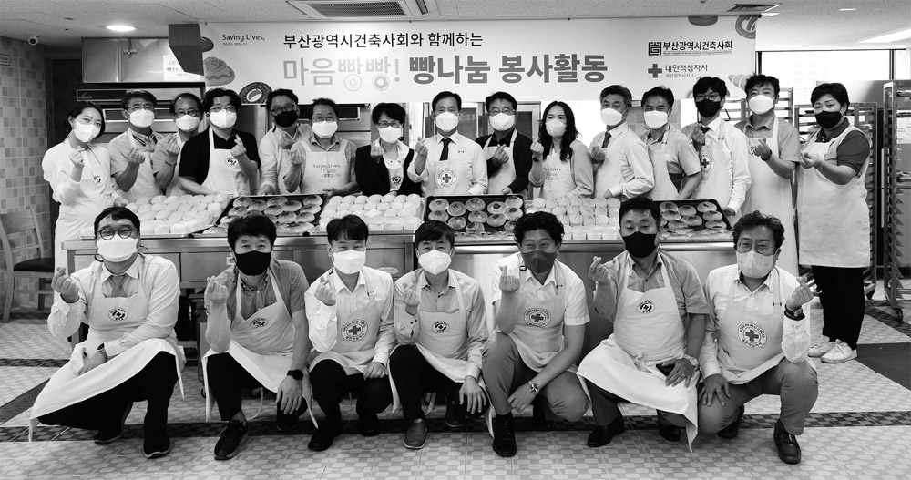 부산광역시건축사회가 대한적십자사 부산지사와 함께 5월 23~24일 양일간 ‘사랑의 빵 전달’ 봉사활동을 실시했다. 사랑의 빵 전달사업은 양 기관이 작년 체결한 MOU의 일환으로, 지역사회 소외계층 지원 사업, 재난 구호 지원활동 동참 등을 협력하기로 약속한 바 있다. 올해 ‘사랑의 빵 전달’ 에는 부산시건축사회 봉사활동 신청회원과 임원진, 위원 등 총 40여 명이 참여해 단팥빵, 카스테라 1,000개를 직접 만들고 포장했다. 빵은 장애인 참배움터, 수영구 부산종합사회복지관, 부산진구청 총 세 곳으로 전달됐다.