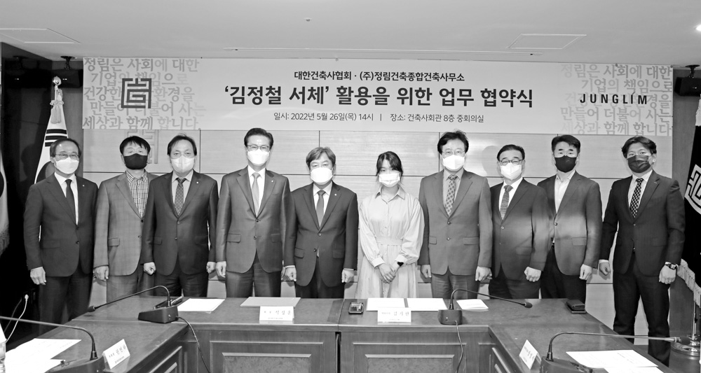 대한건축사협회와 (주)정림건축종합건축사사무소는 5월 26일 오후 건축사회관 8층 중회의실에서 ‘김정철 서체’ 활용을 위한 업무협약 체결식을 가졌다.