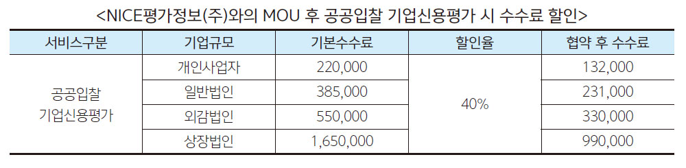 이번 협약으로 건축사공제조합 조합원은 5월 24일부터 NICE신용평가를 통해 공공입찰용 기업신용평가 진행 시 신용평가 수수료를 40% 할인된 금액으로 이용할 수 있다.