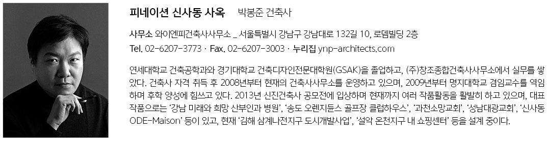 | 피네이션 신사동 사옥 설계자 | 박봉준 _ 와이엔피건축사사무소 건축주 | 박재상(가수 싸이) 감리자 | 박봉준 _ 와이엔피건축사사무소 시공사 | (주)두성기업 설계팀 | 유웅덕, 정진욱, 김민경 대지위치 | 서울특별시 강남구 논현로151길 21 주요용도 | 근린생활시설 대지면적 | 389.00㎡ 건축면적 | 185.99㎡ 연면적 | 1,211.78㎡ 건폐율 | 47.81% 용적률 | 184.97% 규모 | B2F - 5F 구조 | 철근콘크리트구조 외부마감재 | 석대(크리마벨로), 큐블럭(Durastack-SC500), 메탈, 로이복층유리 설계기간 | 2017. 12 - 2018. 10 공사기간 | 2018. 12 - 2020. 04 사진 | 제임스 정 / 내부사진 _ 와이엔피 구조분야 : (주) 이건구조기술사사무소 기계설비분야 : (주) 천일이앤씨 전기분야 : (주) 천일이앤씨 소방분야 : (주) 천일이앤씨 |