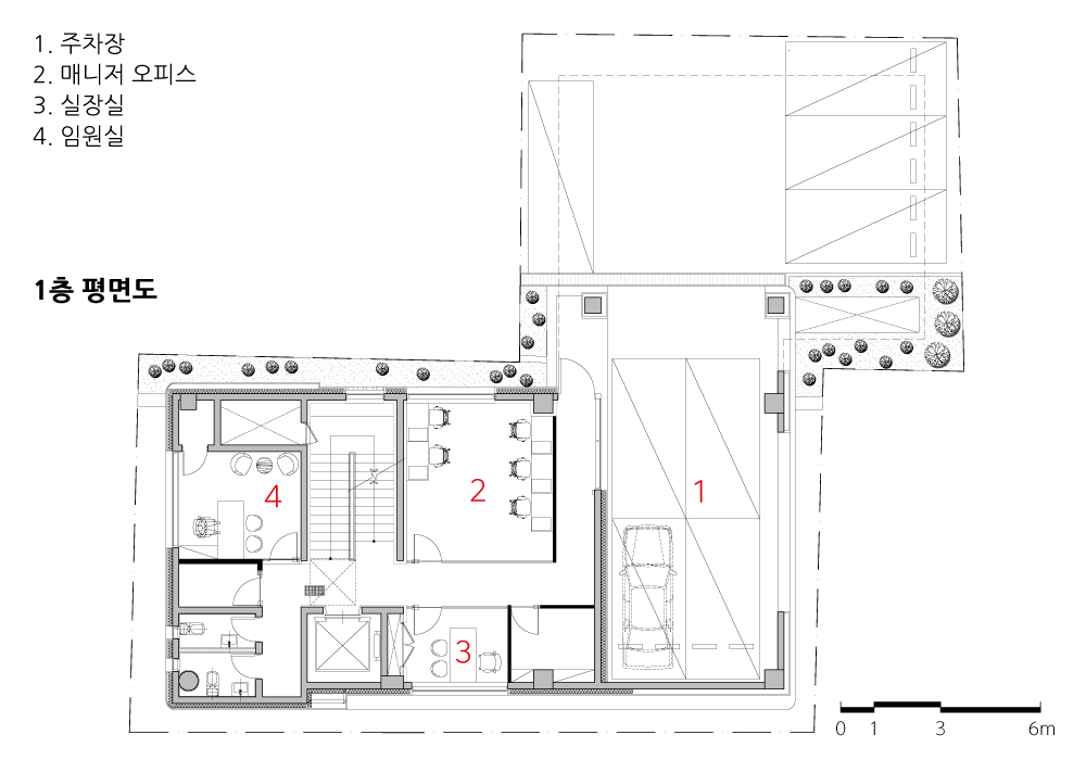 건축주와 건축사는 많은 시간을 같이 보내며, 대지가 가진 사회적, 환경적 한계성 혹은 단점이라 할 수 있는 것들을 거스르지 않고 받아들이면서 장점으로 변화시키는 작업에 꽤 오랜 시간 공을 들여왔다. 그러면서 물리적 공간을 조금 포기하더라도 창의적 공간을 만들어 내는 것에 좀 더 가치를 두었다. 그렇게 만들어진 결과는 공간의 곳곳에 남아있고, 3층과 최상층의 테라스는 저 멀리 있는 남산의 전망을 건물의 내부로 끌어들이는 창의적 숨구멍을 만들어 낼 수 있었다.