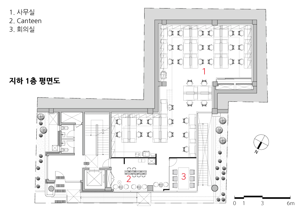 본 작품은 엔터테인먼트 사옥으로서 창의성, 공간활용성과 각 층간조닝의 구분이 명확해야 하기에 업무의 기능을 구성하는 공간, 예술을 창조하는 공간의 구분에 중점을 두었다.