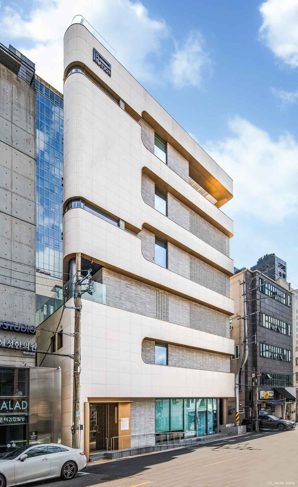 | 피네이션 신사동 사옥 설계자 | 박봉준 _ 와이엔피건축사사무소 건축주 | 박재상(가수 싸이) 감리자 | 박봉준 _ 와이엔피건축사사무소 시공사 | (주)두성기업 설계팀 | 유웅덕, 정진욱, 김민경 대지위치 | 서울특별시 강남구 논현로151길 21 주요용도 | 근린생활시설 대지면적 | 389.00㎡ 건축면적 | 185.99㎡ 연면적 | 1,211.78㎡ 건폐율 | 47.81% 용적률 | 184.97% 규모 | B2F - 5F 구조 | 철근콘크리트구조 외부마감재 | 석대(크리마벨로), 큐블럭(Durastack-SC500), 메탈, 로이복층유리 설계기간 | 2017. 12 - 2018. 10 공사기간 | 2018. 12 - 2020. 04 사진 | 제임스 정 / 내부사진 _ 와이엔피 구조분야 : (주) 이건구조기술사사무소 기계설비분야 : (주) 천일이앤씨 전기분야 : (주) 천일이앤씨 소방분야 : (주) 천일이앤씨 | P NATION Bldg. Architect | Park, Bong-joon _ YnP Architects Client | Park, Jae Sang(PSY) Supervisor | Park, Bong-joon _ YnP Architects Construction | Doosung Co., LTD Project team | Yoo, Woong-Duk / Jung, Jin-Uk / Kim, Min-Kyung Location | 21, Nonhyeon-ro 151-gil, Gangnam-gu, Seoul, Korea Program | Neighbourhood living facility Site area | 389.00㎡ Building area | 185.99㎡ Gross floor area | 1,211.78㎡ Building to land ratio | 47.81% Floor area ratio | 184.97% Building scope | B2F - 5F Structure | RC Exterior finishing | Crema bello, Metal, Q-block(Concrete brick), Low-E Double glazing window Design period | Dec. 2017 - Oct. 2018 Construction period | Dec. 2018 - Apr. 2020 Photograph | James Jeong & YnP Architects Structural engineer | Lee Geon Structural Engineering Co., LTD Mechanical engineer | Cheon Il Engineering & Construction Co., LTD Electrical engineer | Cheon Il Engineering & Construction Co., LTD Fire engineer | Cheon Il Engineering & Construction Co., LTD |