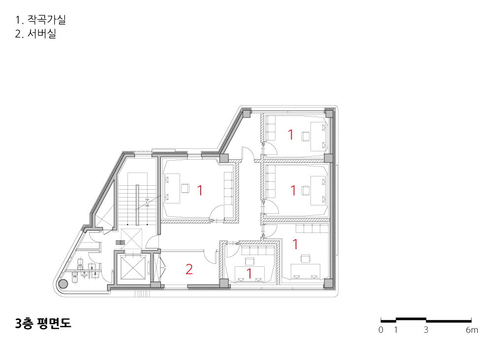 본 작품은 엔터테인먼트 사옥으로서 창의성, 공간활용성과 각 층간조닝의 구분이 명확해야 하기에 업무의 기능을 구성하는 공간, 예술을 창조하는 공간의 구분에 중점을 두었다.