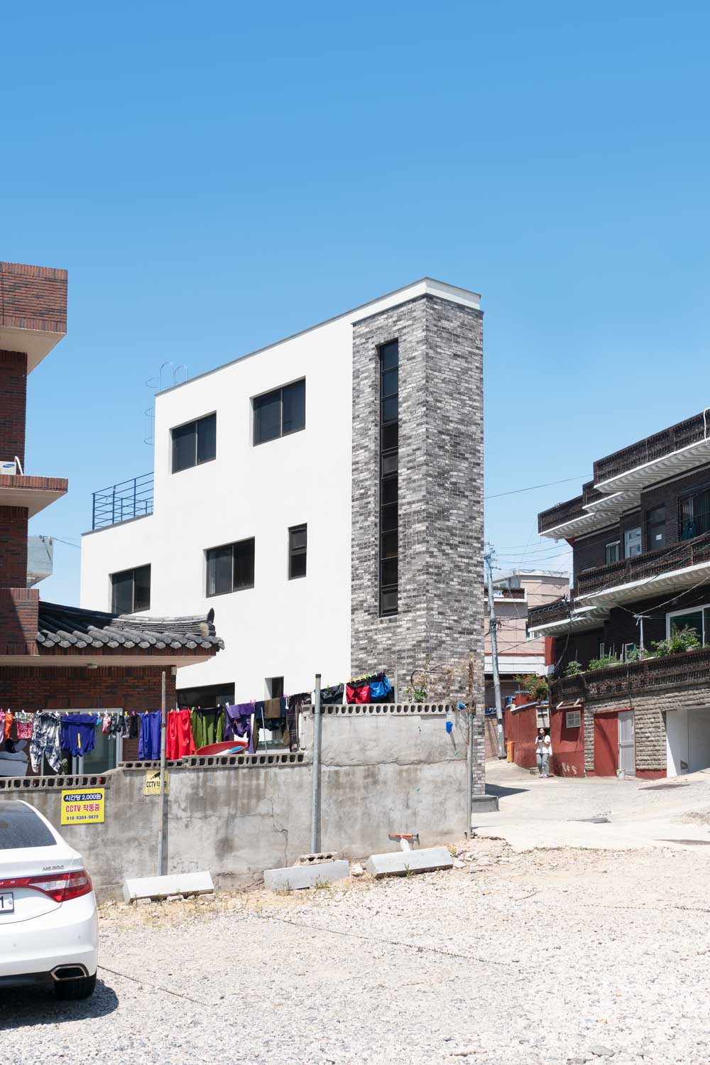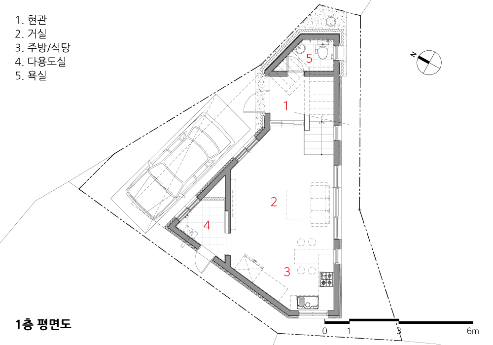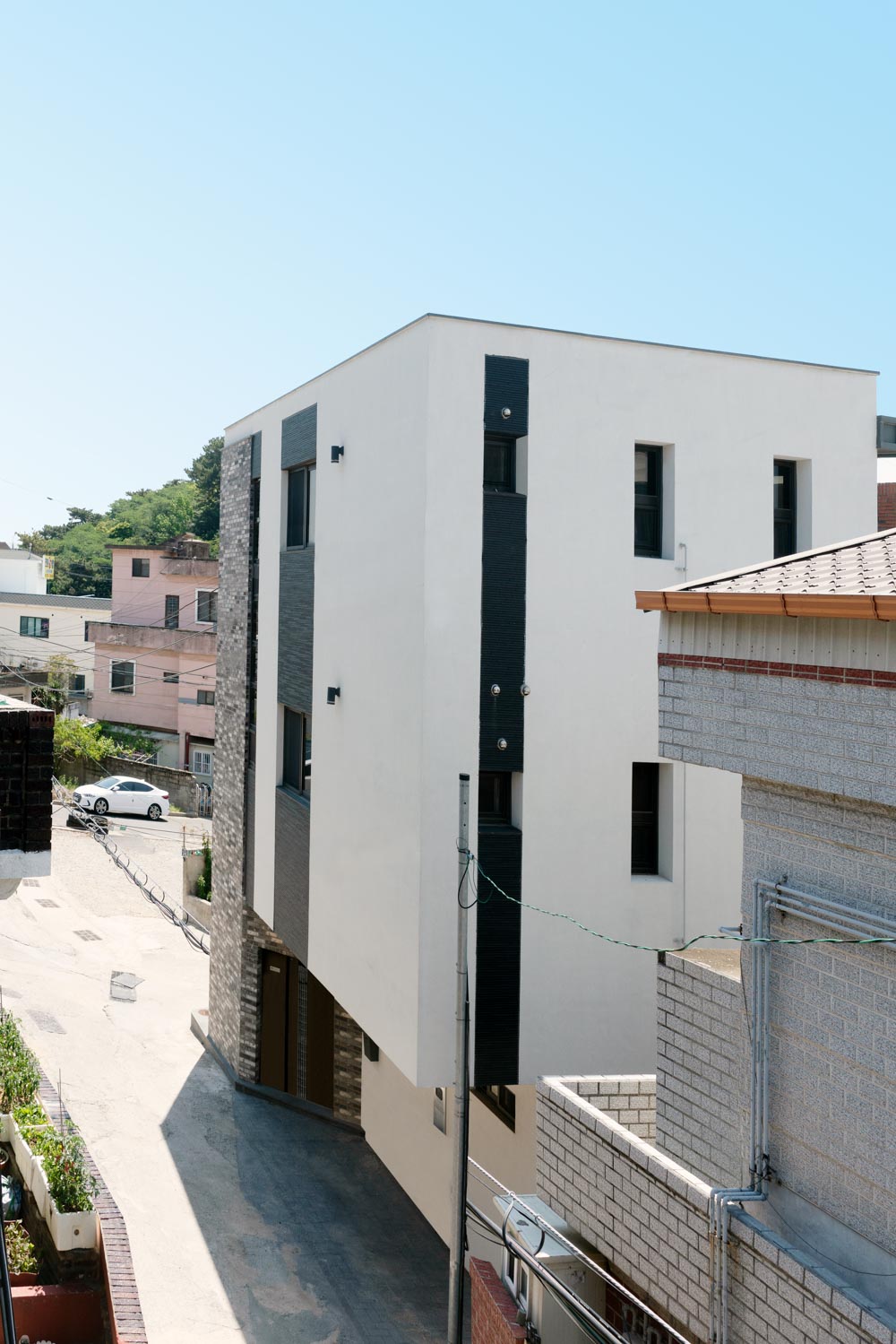 Prologue _ Located in Hakseong-dong, Jung-gu, Ulsan, where old houses are lined up, this site is situated at the entrance to the road frequently used by residents, so it is the first thing people notice even in the alley. The site's shape is an irregular triangle, and since the site is narrow with less than 100㎡, the client was worried about whether it could be a straight house. While securing the width of the road in the north within the legal size, the site area was reduced, so we had to plan it in a smaller area. The client didn't ask for much because the site was not large enough, but he wanted a space that the family could use comfortably on the flat surface as much as possible.