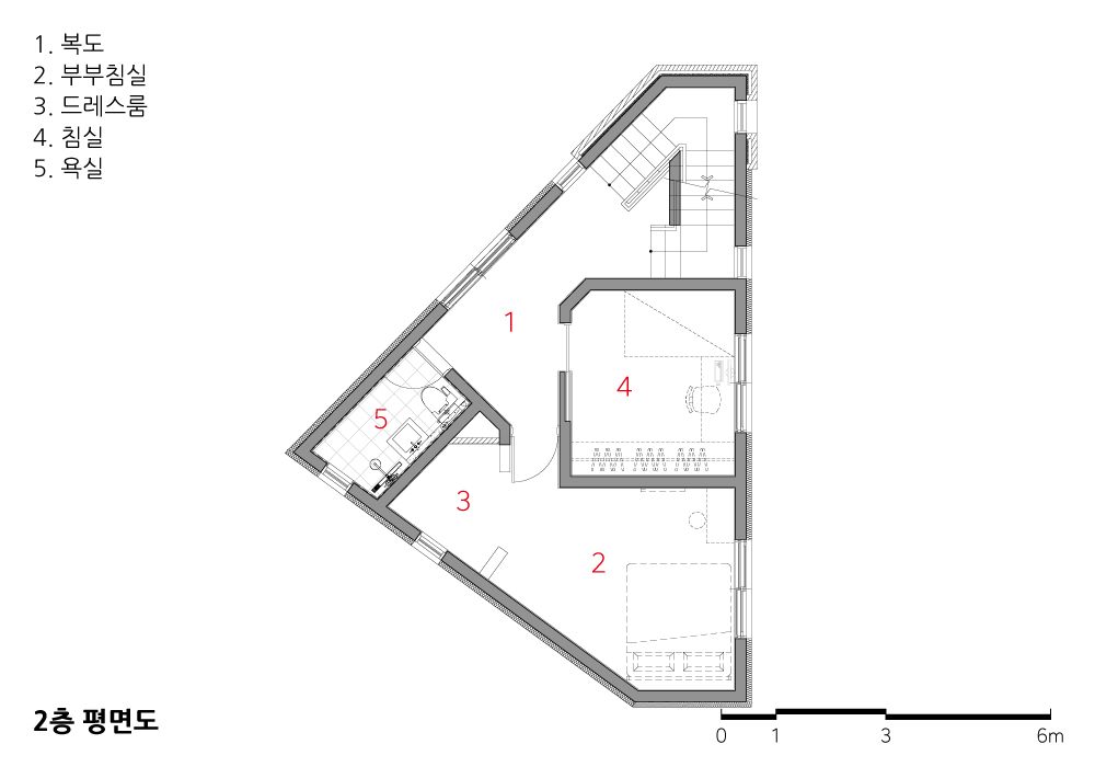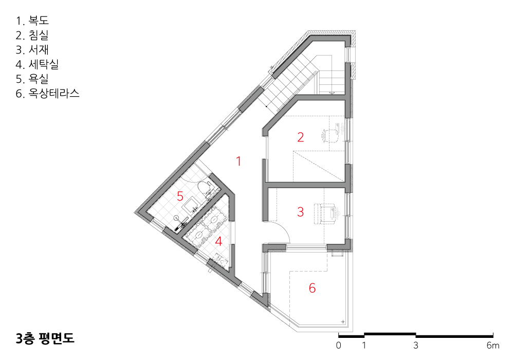 프롤로그 _ 오래된 주택들이 즐비한 울산광역시 중구 학성동에 위치한 대지는 동네 주민들이 많이 이용하는 도로의 진입부에 위치하여 골목에서도 가장 먼저 눈에 띄는 위치이다. 대지형태는 부정형의 세모꼴이며, 100제곱미터 이하의 협소한 대지라서 건축주는 반듯한 집이 나올 지 걱정이 많았다. 북측의 도로 폭을 법적크기만큼 확보하면서 대지면적이 줄어들어 더 작은 면적에서 계획을 해야 했다. 넉넉지 않은 대지면적이라 건축주가 많은 것을 요구하지는 않았지만, 최대한 반듯한 평면에 가족들이 편하게 사용할 수 있는 공간을 원했다.