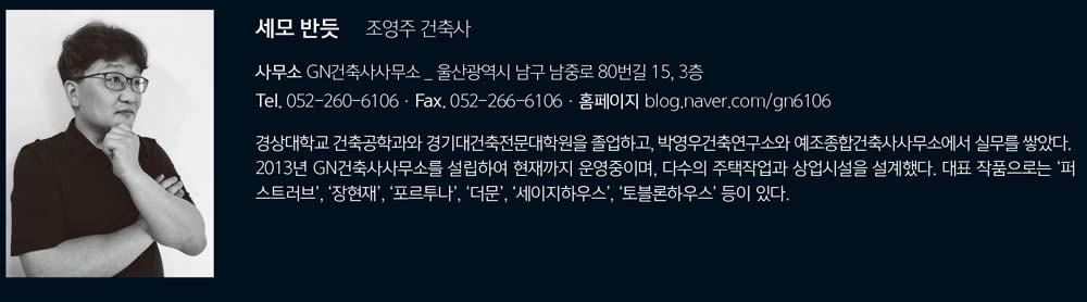 | 세모 반듯 설계자 | 조영주 _ GN건축사사무소 건축주 | 김숙영 감리자 | 조영주 _ GN건축사사무소 시공사 | 건축주 직영 설계팀 | 장혜정, 남상영 설계의도 구현 | GN건축사사무소 대지위치 | 울산광역시 중구 서원13길 27 주요용도 | 단독주택 대지면적 | 97.00㎡ 건축면적 | 53.75㎡ 연면적 | 141.55㎡ 건폐율 | 55.41% 용적률 | 145.93% 규모 | 3층 구조 | 철근콘크리트구조 외부마감재 | 스타코, 청고벽돌, 세라믹사이딩 내부마감재 | 강마루, 타일, 벽지 설계기간 | 2017. 12 - 2018. 08 공사기간 | 2018. 08 - 2019. 05 사진 | 장혜정, 남상영 전문기술협력 - 구조분야 : 플러스구조이앤씨(주) - 기계설비분야 : 금강디엔에스 주식회사 - 전기분야 : 금강디엔에스 주식회사 |