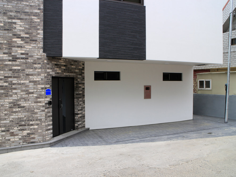 Elevation plan _ The entrance to the alley was finished with white stucco to make it look bright, and it was planned to harmonize with the neighborhood and highlight its personality by giving points with old blue bricks. In addition, the exterior wall lighting was installed in a dark alley where there were not many street lights so that it would be bright even at night.