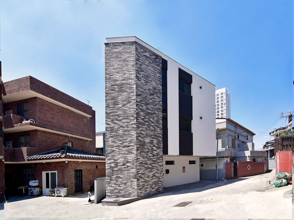 입면계획 _ 골목 입구를 환하게 보이도록 흰색 스타코로 마감하고 청고벽돌로 포인트를 주어 동네와 조화를 이루면서 개성이 돋보이도록 계획하였다. 또 가로등이 많지 않은 어두운 골목에 건물 외벽 조명을 설치하여 밤에도 환하도록 계획하였다.