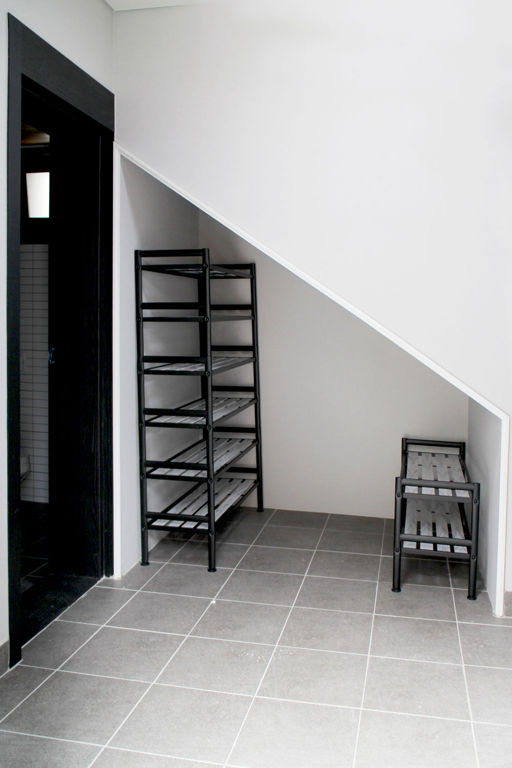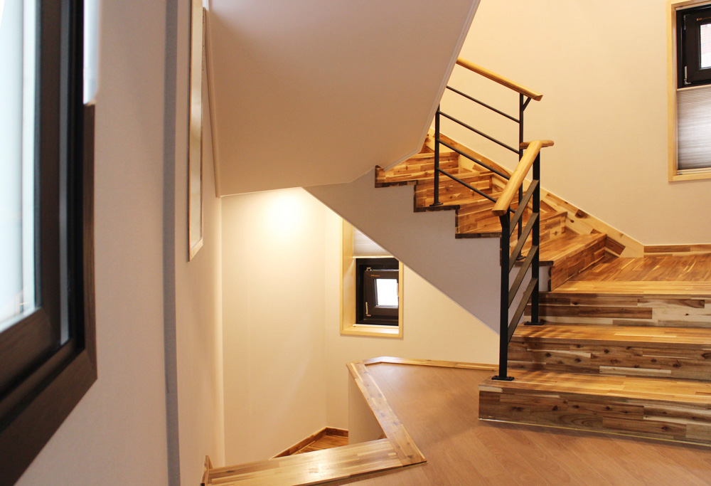 Floor planning _ The entrance is designed to be adjacent to the parking lot to enter it directly, so it is more convenient when it rains, or they have heavy luggage. There is a separate toilet to wash their hands immediately before entering the indoor space from the front door, and it is advantageous in terms of noise and odor as it is placed far from the living room and the kitchen, which are shared spaces. The living room and the kitchen are placed to look spacious as one space, and a shoe rack is put in the leftover space under the stairwell, thereby improving spatial utilization. The windows on the first floor close to the road and the adjacent site were installed above a certain height from the ground to protect privacy.