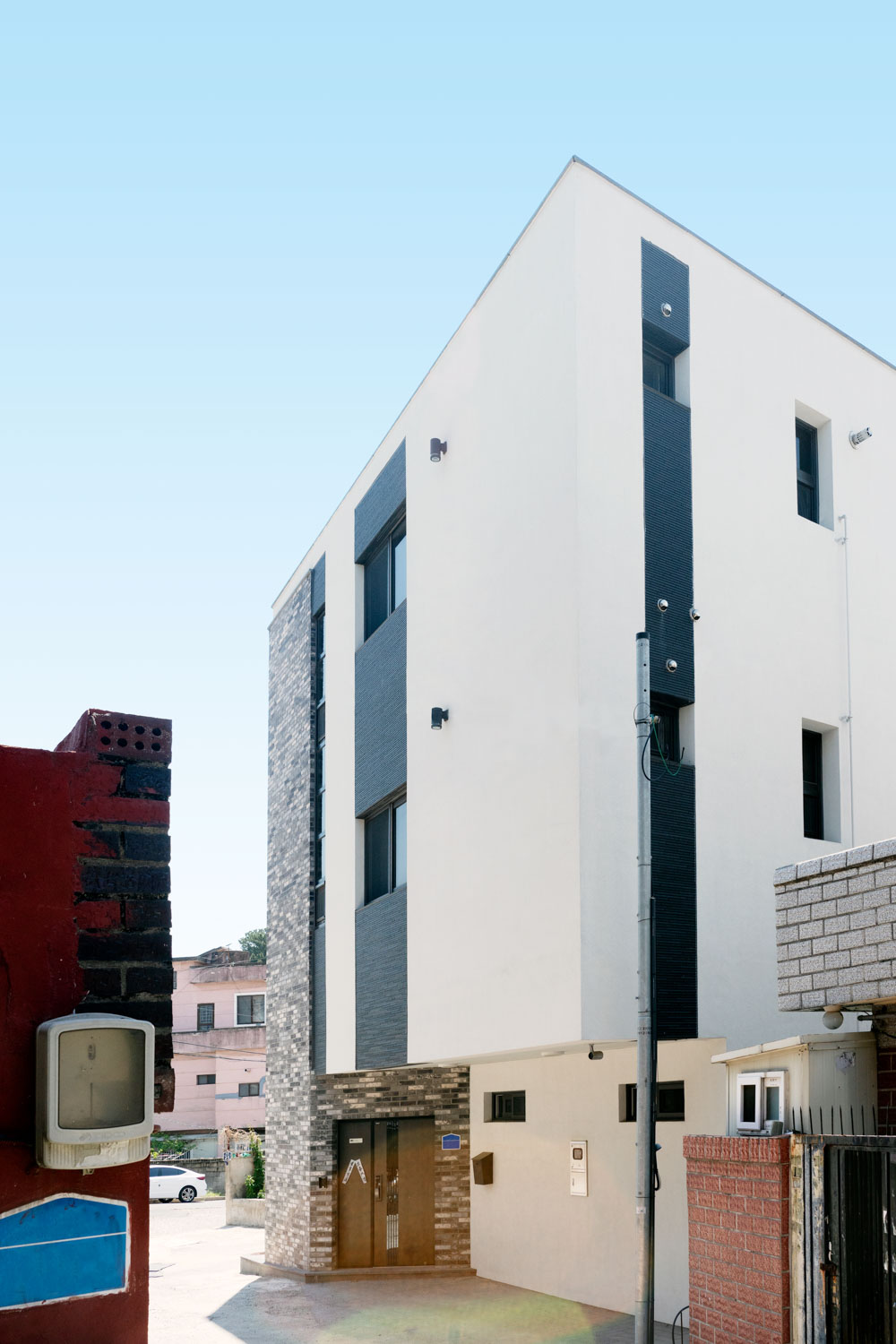 입면계획 _ 골목 입구를 환하게 보이도록 흰색 스타코로 마감하고 청고벽돌로 포인트를 주어 동네와 조화를 이루면서 개성이 돋보이도록 계획하였다. 또 가로등이 많지 않은 어두운 골목에 건물 외벽 조명을 설치하여 밤에도 환하도록 계획하였다.