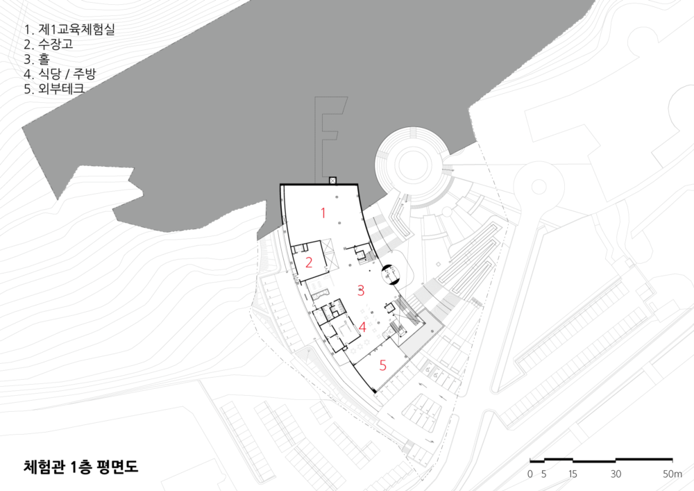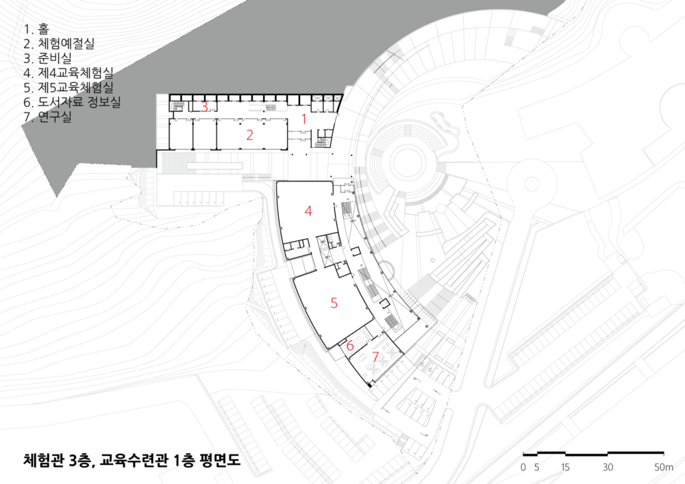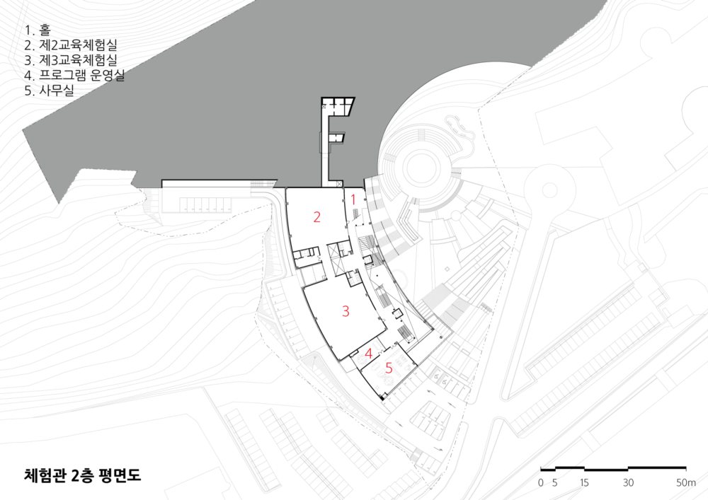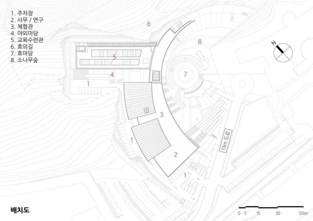 자연의 길에 앉혀진 효문화 진흥원은 걸어가면서 효의 의미를 일깨우는 공간이다. 내부의 기능들은 자연스럽게 외부로 이어지고, 외부공간은 자연과 동화되어 효를 체험하는 놀이의 마당이 된다.