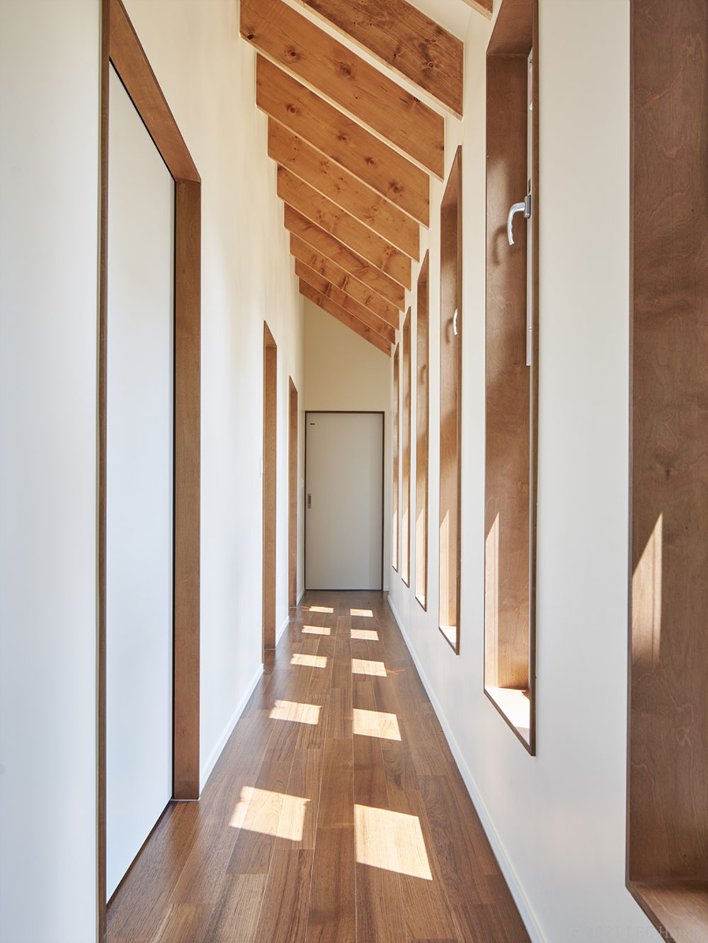 설계할 당시의 집 이름은 ‘달리는 집’이었다. 막둥이의 넘치는 에너지를 담아줄 수 있는 공간이길 바랐고, 안팎으로 자연요소를 쉽게 접할 수 있는 구성으로 계획했다. 시시각각 변하는 복도와 중정의 빛, 그림자, 하늘, 바람, 비, 나뭇잎의 변화, 낙엽, 수돗가, 모래, 촉감을 위한 벽과 바닥재, 밝은 색과 짙은 색의 대비 등등…… 항상 감각과 감정이 깨어있기를, 깨어나기를 바랐다.