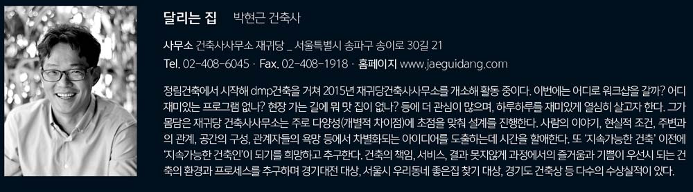 막둥이가 많이 좋아지고 있다는 이야기를 들었고, 입주 3개월 즈음 되니 긴 복도 등도 점점 적응이 되고 있다고 했다. 겨울에 공사하며, 추위에 떨면서 먹었던 어묵탕을 소환해 초대하겠다는 건축주의 다짐은 코로나로 인해 미뤄지고 있다. 어묵탕 초대를 하는 날 집의 현판을 전달하고 싶다. 집의 이름을 바꿔서…… ‘행복으로 달리는 집’이라고.