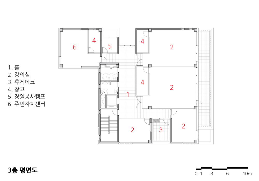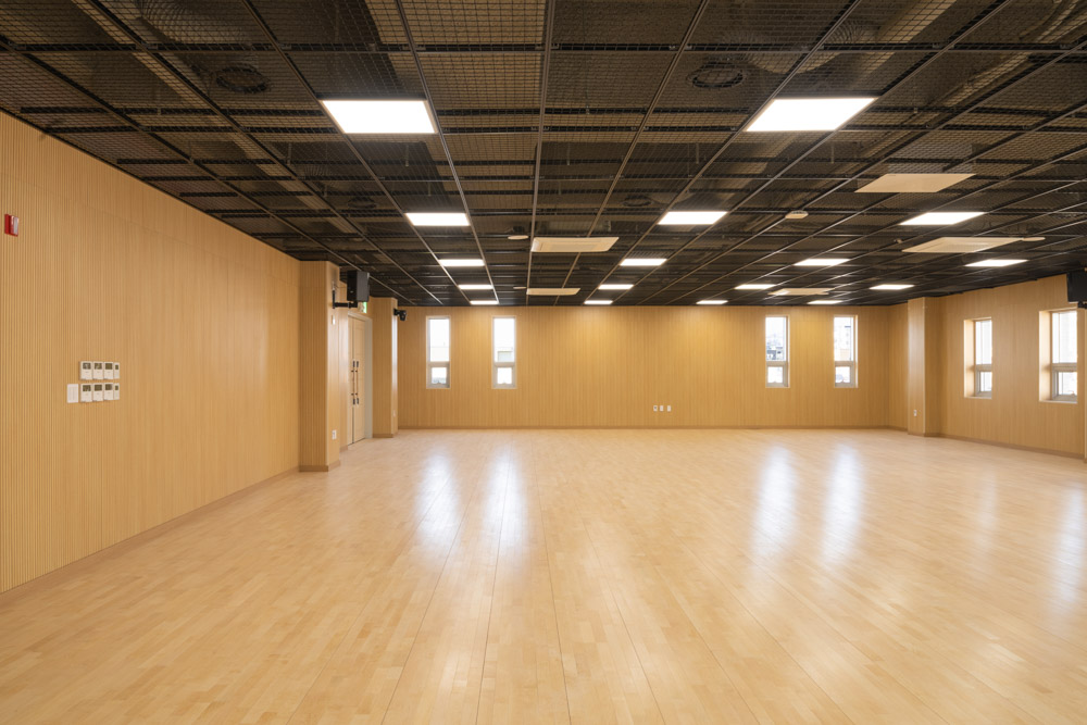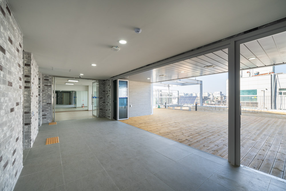 The multipurpose room, used by a large number of people, was independently placed on the fourth floor. Not only the multipurpose room, but also the utility room, available for simple cooking during various events and sufficient storage spaces, were secured. On the 5th floor, independent Reserve Forces Training Management Center, and the specialized space for residents were arranged. The specialized space for residents connected to outside is served as a multipurpose shelter for simple leisure and sports.
