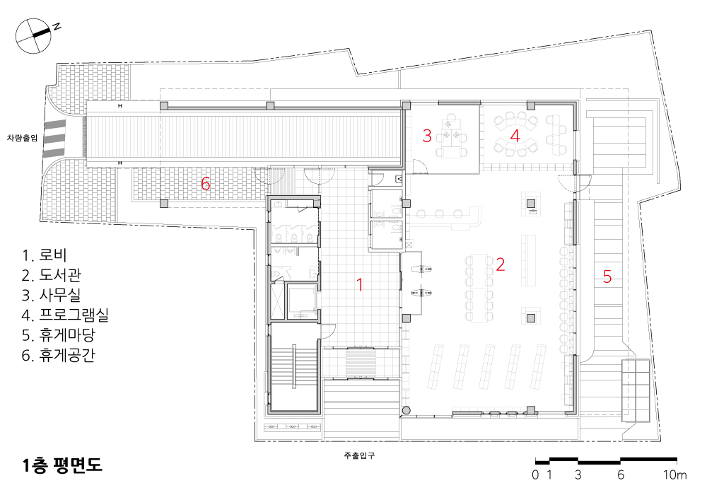 Even though the basement floor is shaped like a heterogeneous land, the parking area was secured as much as possible, by making the most of the available space. Opening the space to local residents on weekends contributes to solve the parking difficulties in the area as well. In addition, the library, not a civil service room, was placed on the first floor. with the concept of an office building where residents can easily access and take a rest,