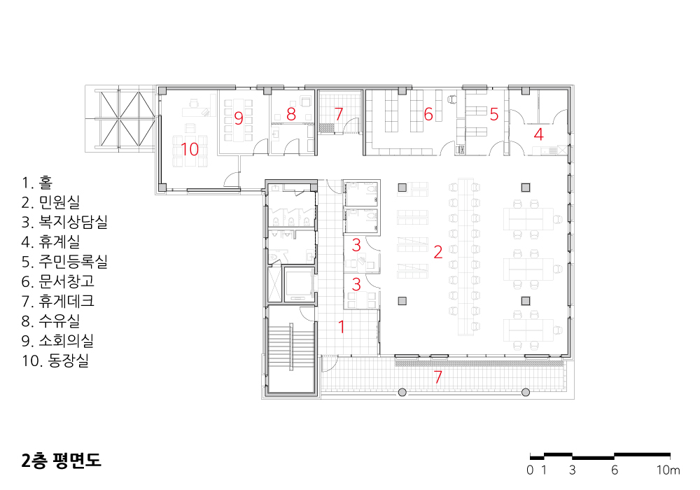 2층에는 동장실과 민원실을 같은 층에 배치하여 업무의 효율성을 높이고, 충분한 공용공간과 외부공간을 계획하여 주민들이 민원실을 이용하는 데 쾌적한 환경을 조성하였다. 주민자치센터와 강의실이 있는 3층은 공간을 가변적으로 쓸 수 있게 구성하여 다양한 성격의 교육과 문화활동을 지원할 수 있도록 공간을 계획하였다.