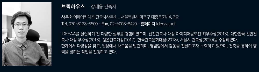 | 브릭하우스 설계자 | 강제용 _ 이데아키텍츠 건축사사무소 건축주 | 이상도 감리자 | 강제용 _ 이데아키텍츠 건축사사무소 설계팀 | 김선동 대지위치 | 경기도 용인시 처인구 남동 주요용도 | 단독주택 대지면적 | 591.00㎡ 건축면적 | 118.08㎡ 연면적 | 175.49㎡ 건폐율 | 19.98% 용적률 | 26.59% 규모 | 2층 구조 | 철근콘크리트구조 외부마감재 | 치장벽돌 내부마감재 | 벽·천장 _ 도장 / 바닥 _ 강마루 설계기간 | 2018. 01 – 2018. 07 공사기간 | 2018. 07 – 2019. 05 사진 | 최진보 전문기술협력 - 구조분야 : (주)이든구조컨설턴트 - 기계설비분야 : 아이에코 ENG - 전기분야 : 아이에코 ENG - 소방분야 : 아이에코 ENG |
