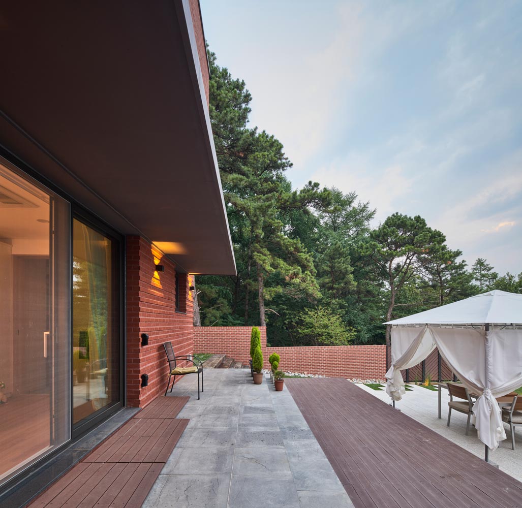 ‘ㄴ’자 형태의 매스는 건물을 이용해 대지 내·외부를 명확하게 분리하여 마당의 프라이버시를 확보함과 동시에 마당 넓이를 최대한 확보할 수 있다는 장점이 있었다. 1층 메스를 남쪽, 동쪽으로 길게 뻗어 2층에서 접근할 수 있는 테라스를 확보하였고, 테라스 상부에 충분한 크기의 캐노피를 설치하여 테라스를 효과적으로 활용하도록 하였다. 1층에도 거실과 주방, 침실에서 바로 접근할 수 있는 넓은 목재 데크와 조경석을 깔아 외부공간을 충분히 활용하도록 하였다.