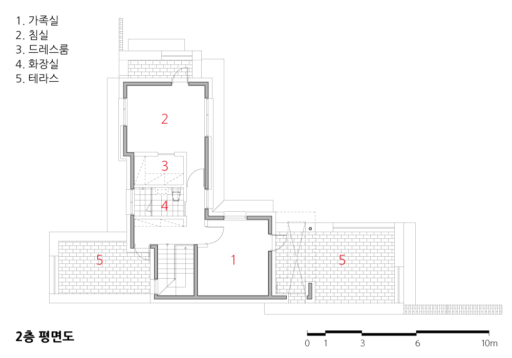 집을 외부에서 보았을 때 여러 개의 매스가 맞물려 있는 형상인데, 외부재료로는 벽돌을 적용하였으며 마감재료인 벽돌의 물성을 더 잘 보여줄 수 있도록 고민하였다.