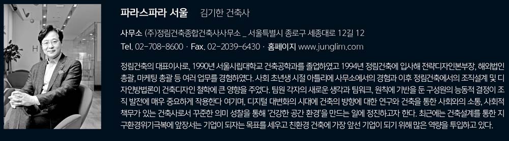 | 파라스파라 서울 설계자 | 김기한_ (주)정림건축종합건축사사무소 공동설계 | 민성진(미국건축사) _ SKM Architects 건축주 | (주)정상북한산리조트 감리자 | (주)정림건축종합건축사사무소 시공사 | (주)삼정기업 설계팀 | 정림건축종합건축사사무소 _ 김영훈, 권순찬, 구본억, 이예찬 SKM Architects _ 한현수, 류현수, 김승욱, 오종무 설계의도 구현 | (주)정림건축종합건축사사무소 + SKM Architects 대지위치 | 서울특별시 강북구 우이동 346 주요용도 | 숙박시설(휴양콘도미니엄) 대지면적 | 80,146.40㎡ 건축면적 | 14,909.16㎡ 연면적 | 99,829.45㎡ 건폐율 | 18.60% 용적률 | 78.99% 규모 | 지하 3층 - 지상 7층 구조 | 철근콘크리트구조 외부마감재 | 화강석(블랑코머핀), 현무암혼드 내부마감재 | 석재(MOCA CREAM), 목재(OAK) 설계기간 | 2018. 08 – 2019. 11 공사기간 | 2019. 11 – 2021. 07 사진 | 김현수, 심기섭(드론촬영) 전문기술협력 - 구조분야 : (주)아이스트테크 - 기계설비분야 : (주)정도설비 - 전기분야 : (주)진전기엔지니어링 - 소방분야 : 한방유비스(주) |