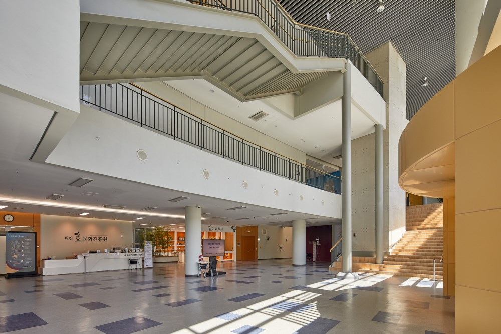 | 효문화진흥원 설계자 ┃ 조도연 KIRA ┃ (주)디엔비 건축사사무소 건축주 | 대전광역시장 감리자 | 조차연 _ 건축사사무소 조성건축 시공사 | (주)녹원종합건설(파크건설) 설계팀 | 이경환, 조보광, 홍훈표, 유영관, 김성진 대지위치 | 대전광역시 중구 뿌리공원로 47일원 주요용도 | 교육연구시설 대지면적 | 22,300.00㎡ 건축면적 | 3,515.30㎡ 연면적 | 8,342.05㎡ 건폐율 | 15.76% 용적률 | 30.39% 규모 | 지하 1층, 지상 3층 구조 | 철골조, 철근콘크리트조 외부마감재 | 노출콘크리트, 접합제 진강판, 알루미늄루버, 합성목재루버, 점토벽돌, 로이복층유리 내부마감재 | 화강석물갈기, 혼합질비닐계무석면타일, 목재흡음판, 카펫타일, 친환경페인트, 석재타일 설계기간 | 2013. 06 ~ 2014. 08 공사기간 | 2015. 02 ~ 2017. 02 사진 | D&B 구조분야 : 동양구조 기계설비·전기·소방분야 : (주)수양ENG |