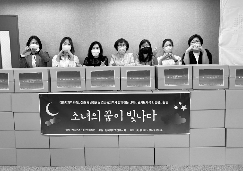 경상남도건축사회 김해지역건축사회는 5월 20일 글로벌 아동권리 전문 NGO 굿네이버스 경남동부지부와 함께 김해시 관내 취약계층 및 저소득가정 여아 지원을 위한 후원금 320만 원을 전달하고, ‘소녀의 꿈 응원 상자’ 제작 봉사활동을 진행했다.