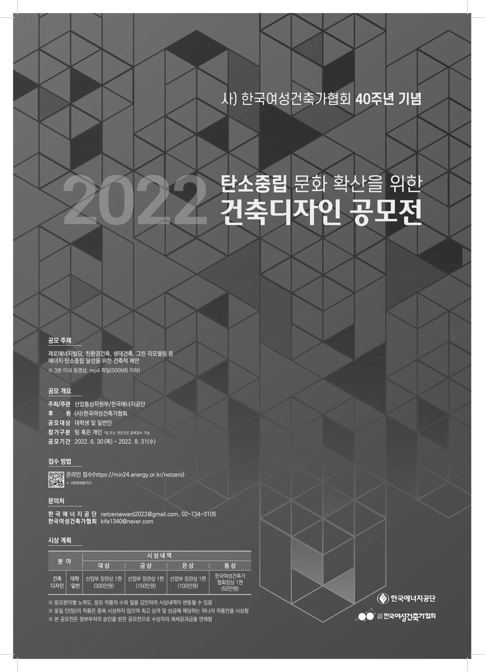 문의는 한국에너지공단(newzeroward2022@gmail.com, [공모전 사무국]02-734-3105), 한국여성건축가협회(kifa1340@naver.com) 등으로 하면 된다.